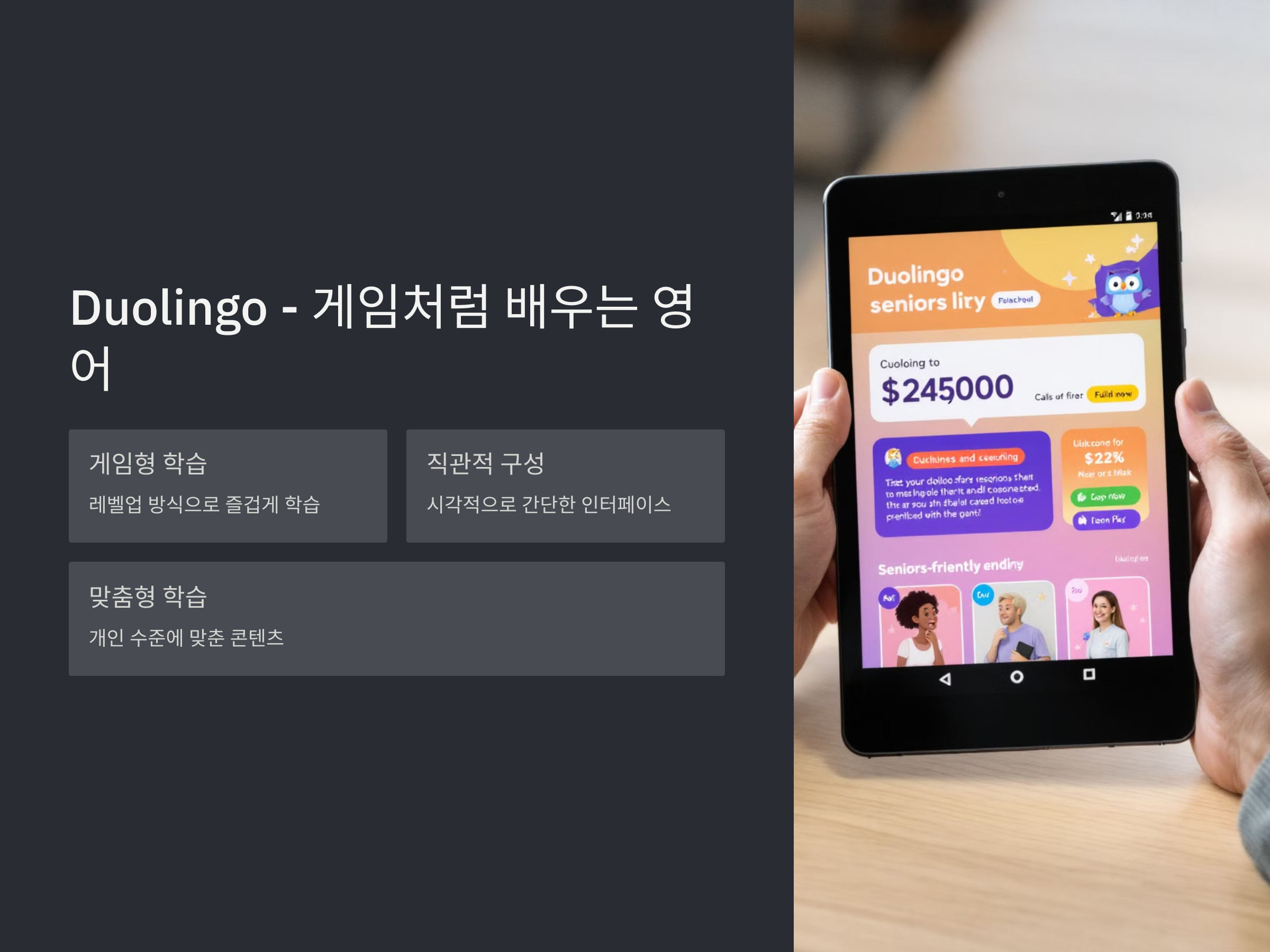 Duolingo는 영어뿐만 아니라 다양한 언어를 배우는 데 유용한 앱으로, 특히 시니어분들에게 인기가 높습니다. 이 앱은 게임과 비슷한 방식으로 구성되어 있어 학습을 즐기면서 진행할 수 있습니다. 각 단원마다 레벨업 형식으로 영어 문법, 단어, 발음 등을 연습할 수 있기 때문에 학습 동기를 부여하며, 반복적인 퀴즈와 게임 요소가 있어 쉽게 지루하지 않게 학습할 수 있습니다.