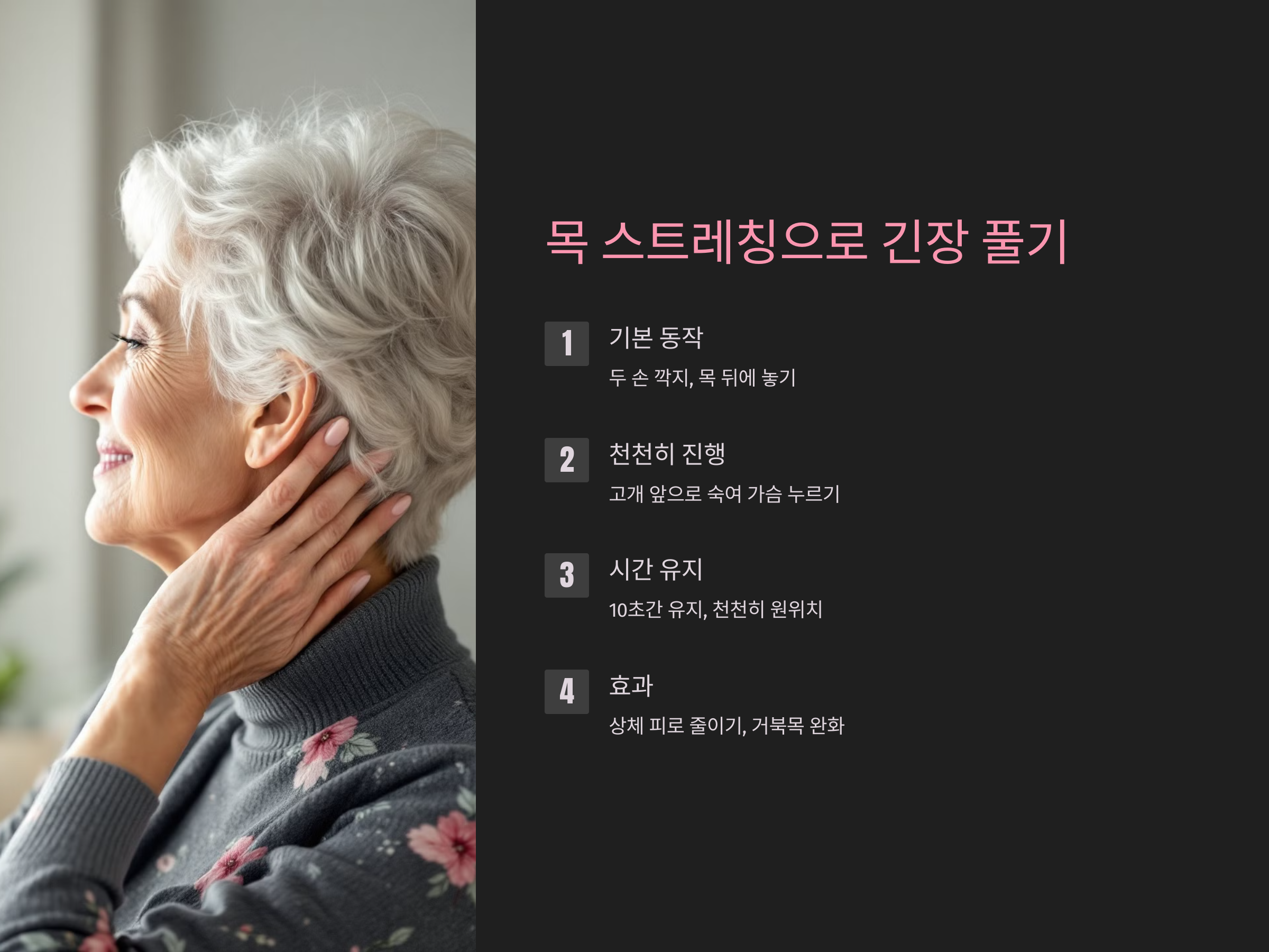 목은 하루 동안 많은 압력을 받는 부위 중 하나입니다. 특히 컴퓨터를 많이 사용하는 시니어분들은 목의 긴장이 심할 수 있는데요, 이럴 때 간단한 스트레칭을 통해 목의 피로를 풀어주는 것이 중요합니다.