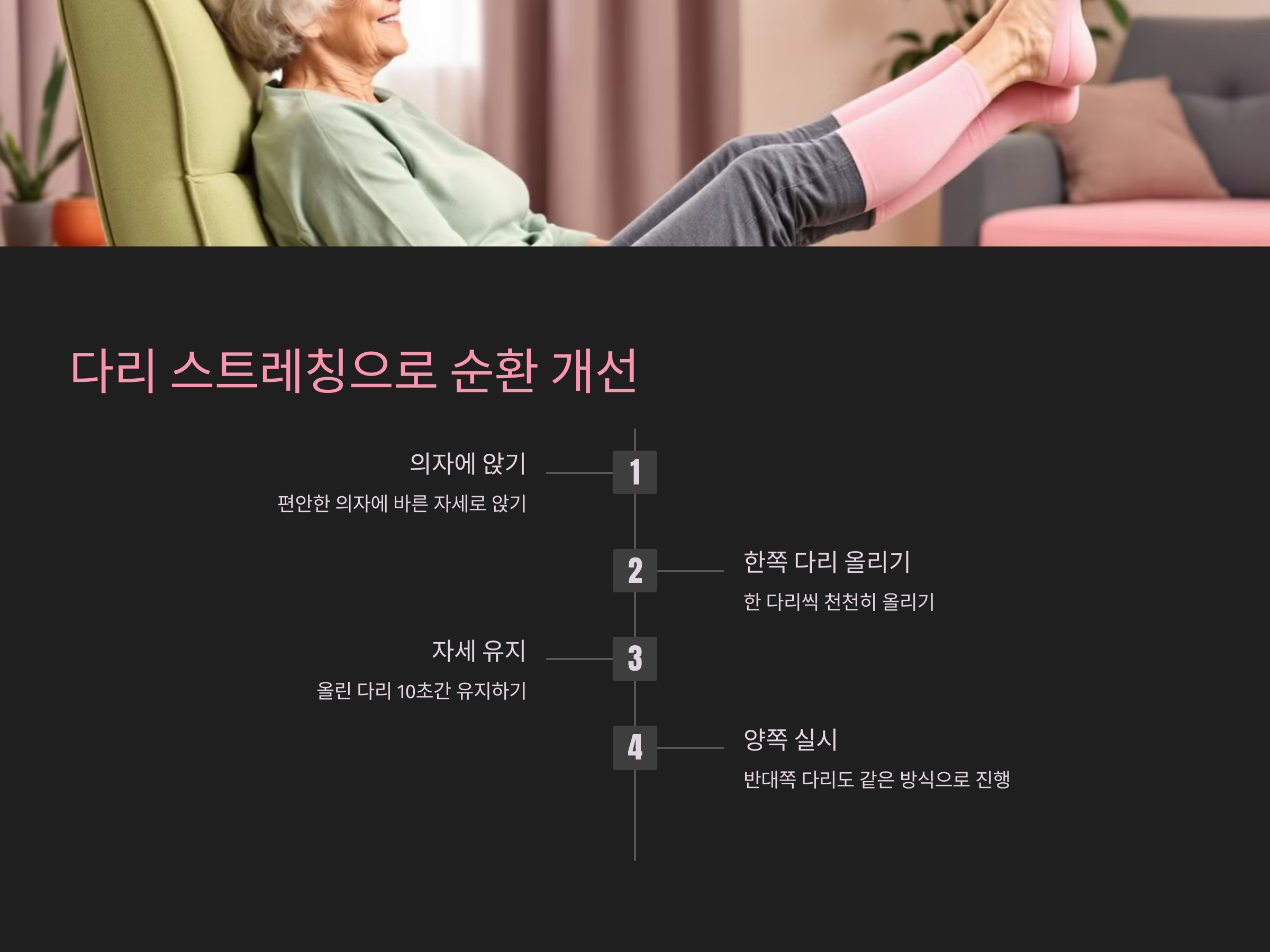 하체의 순환 문제는 나이가 들수록 심해지기 쉽습니다. 다리의 피로와 부종을 예방하고, 혈액순환을 개선하는 데에는 다리 스트레칭이 큰 도움이 됩니다. 또한, 다리 근육을 풀어주면 균형을 잡는 데도 유리합니다.