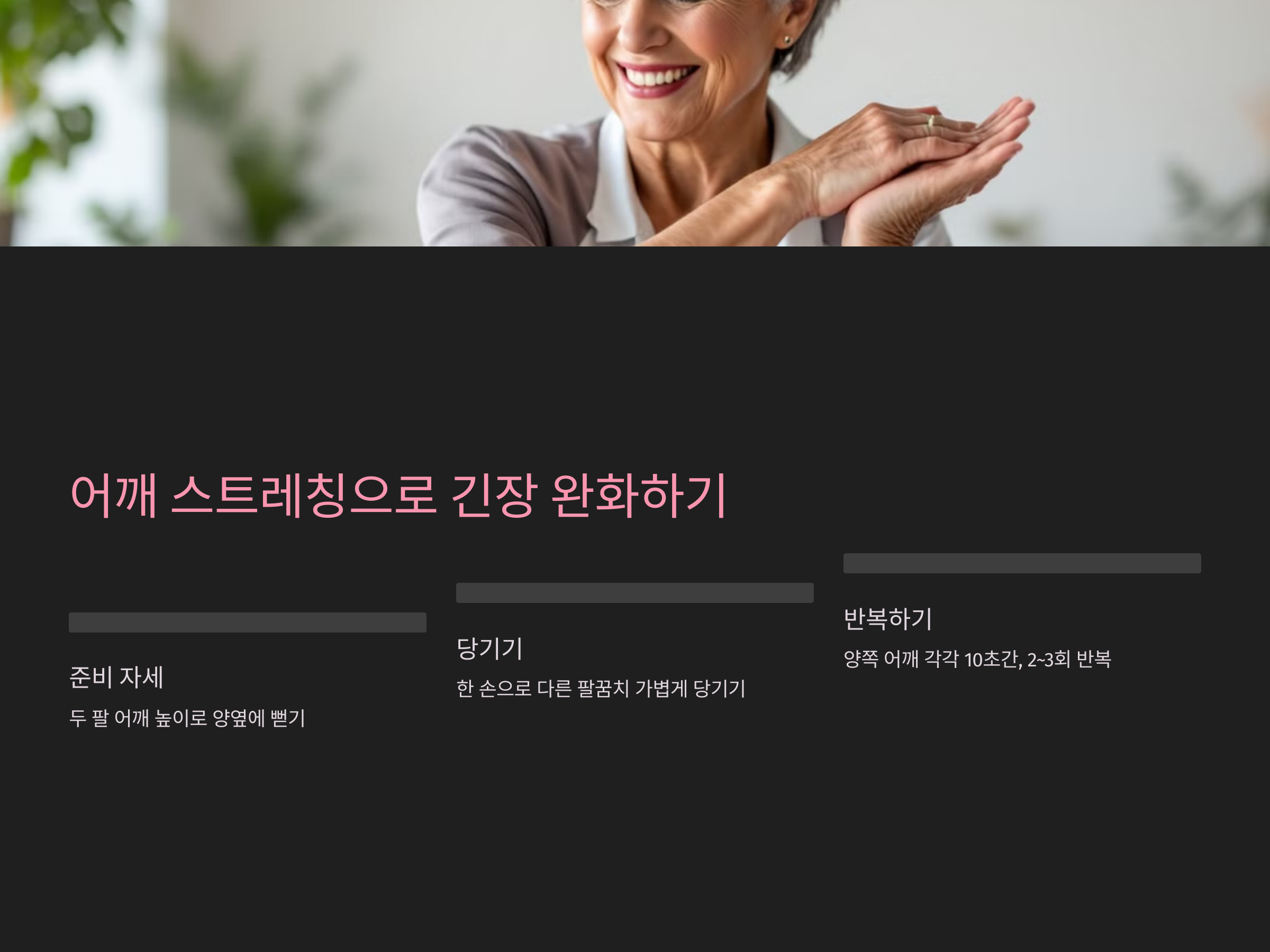 - 양쪽 어깨를 각각 10초간 당기며, 2~3회 반복합니다.