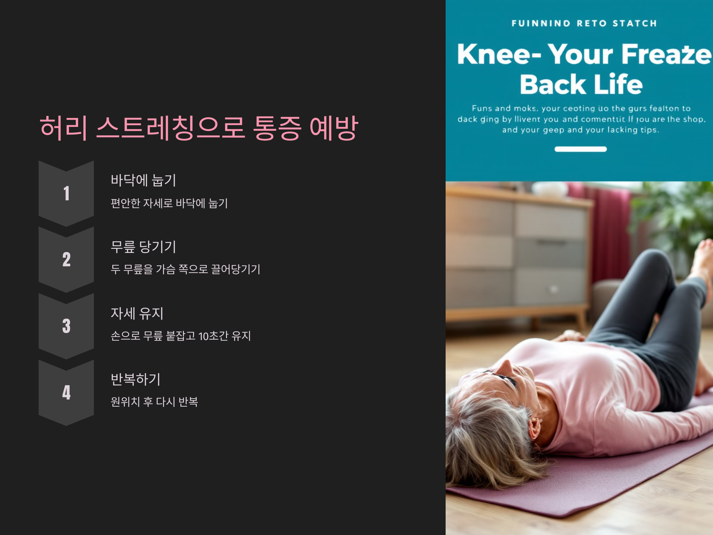 허리 스트레칭은 무리하지 않도록 주의하며 천천히 동작을 진행합니다. 이 방법은 허리 근육을 강화하고, 나아가 척추의 유연성을 높이는 데 효과적입니다.
