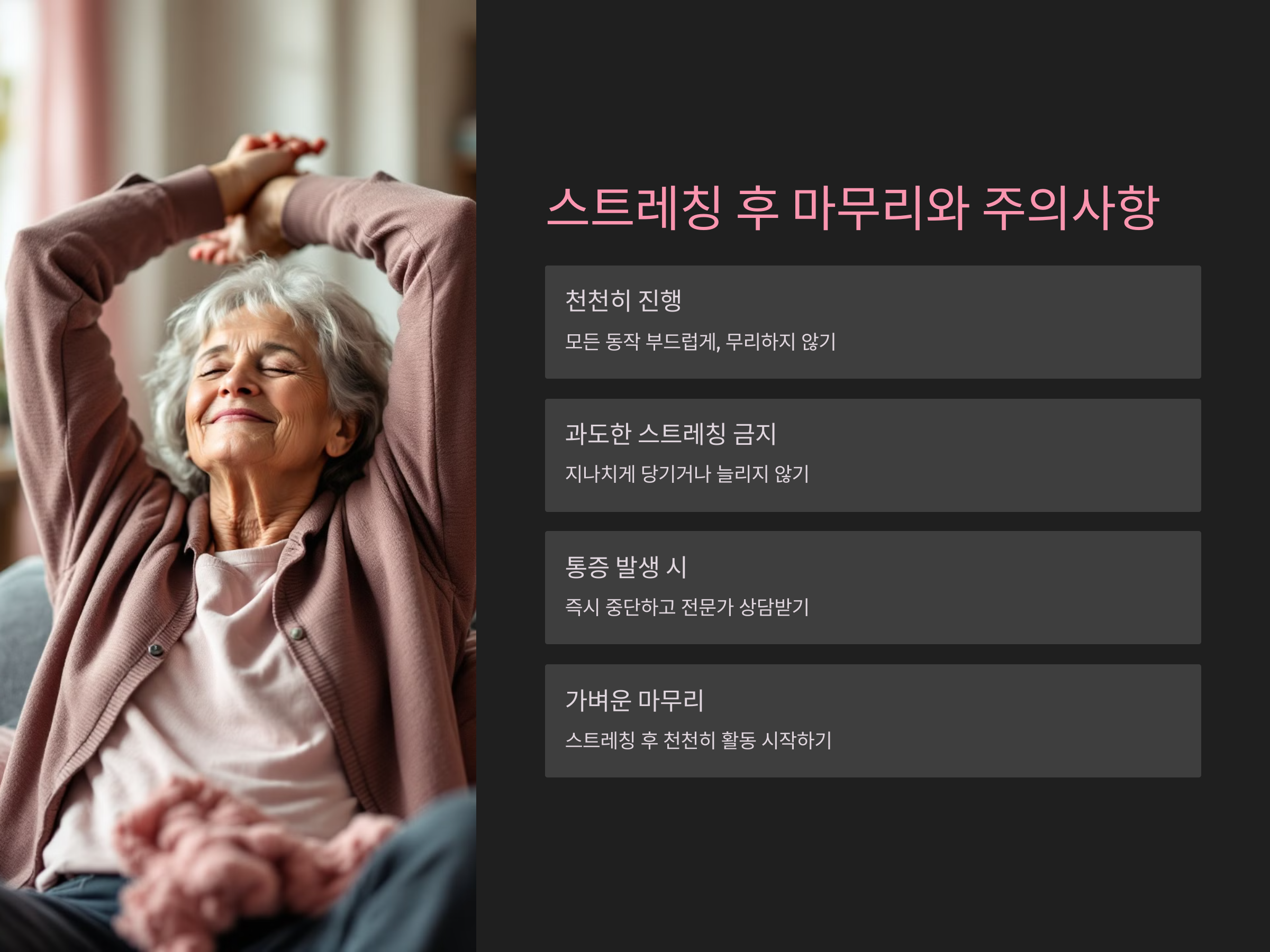스트레칭 후에는 항상 가벼운 마무리 운동을 해주어야 합니다. 몸의 근육이 풀린 상태에서 갑자기 활동을 시작하면 오히려 근육에 부담을 줄 수 있기 때문에, 스트레칭 후에는 천천히 몸을 움직여야 합니다. 또한, 각 동작을 할 때 무리하지 않도록 하고, 통증이 느껴지면 즉시 중단하는 것이 중요합니다.