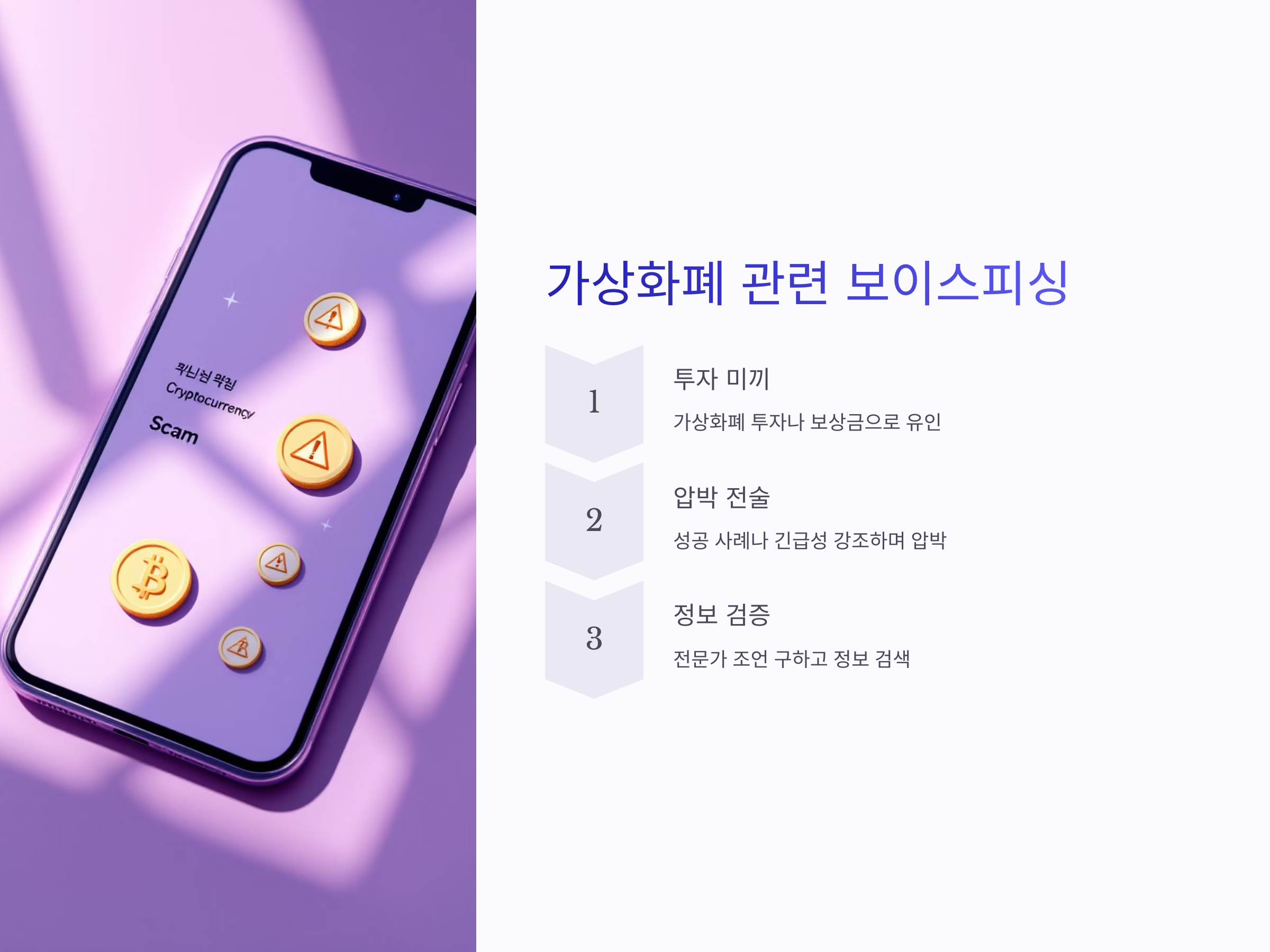 가상화폐는 빠르게 성장하고 있으며, 이를 악용한 보이스피싱이 급증하고 있습니다. 범죄자는 가상화폐 투자나 보상금을 미끼로 피해자에게 전화를 걸어 큰 금액을 투자하도록 유도합니다. ‘가상화폐 투자에 성공했다’거나 ‘반드시 투자해야 한다’는 말로 피해자를 압박하여, 사기를 치는 방식입니다.
