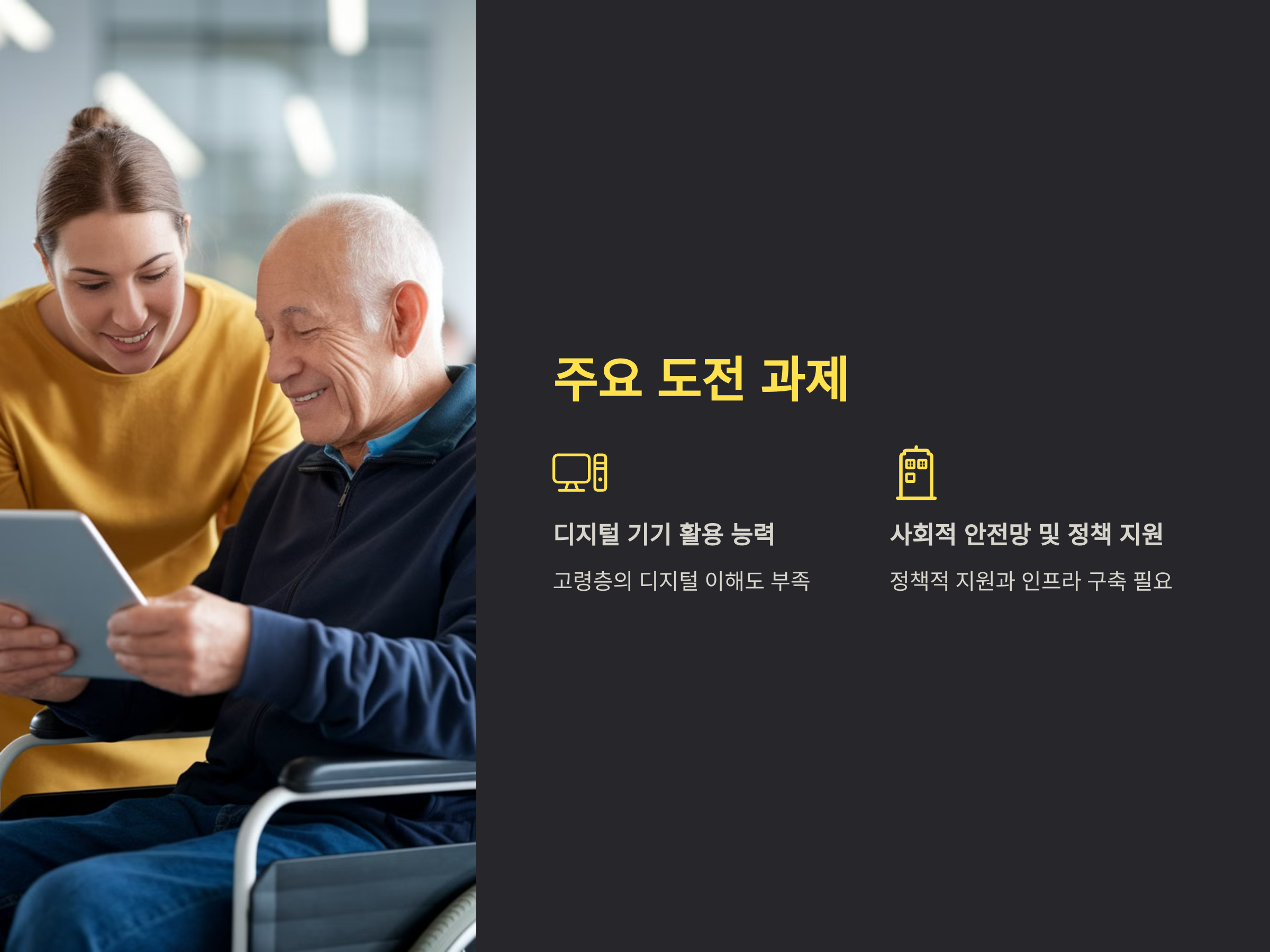 실버산업의 성장은 기회만큼 도전도 동반합니다. 그 중 가장 큰 도전 과제는 바로 고령층의 디지털 기기 활용 능력입니다. 많은 고령층은 디지털 기기에 대한 이해도가 낮거나, 기술적 장애물로 인해 새로운 기기나 서비스를 사용하기 어렵다고 느낄 수 있습니다. 따라서 실버산업은 기술 개발 뿐만 아니라, 고령층이 쉽게 접근하고 이해할 수 있는 인터페이스와 교육 프로그램을 제공하는 것이 중요합니다.