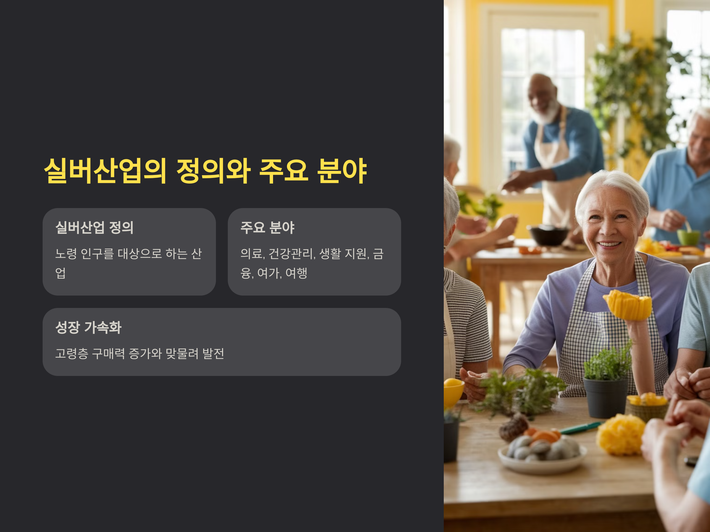 실버산업(Silver Industry)은 주로 노령 인구를 대상으로 하는 산업으로, 고령화 사회에 맞춰 다양한 서비스를 제공하는 시장을 일컫습니다. 2025년에는 전 세계 고령 인구가 급증할 것으로 예상되며, 이에 따라 실버산업은 새로운 경제적 기회로 주목받고 있습니다. 실버산업의 주요 분야로는 의료, 건강관리, 생활 지원, 금융, 여가, 여행 등 다양한 영역이 포함됩니다.