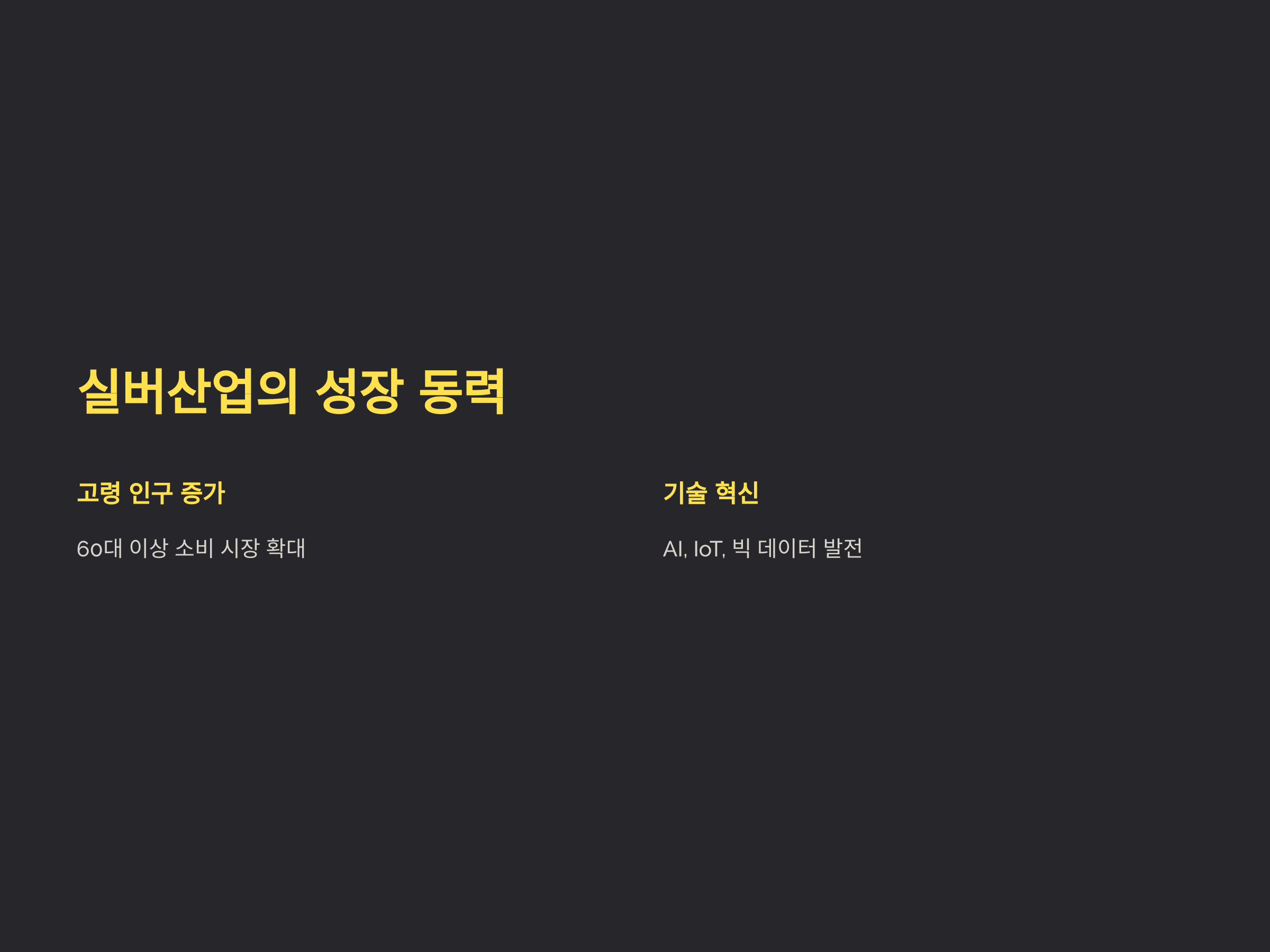 실버산업의 성장 동력은 크게 두 가지로 나눌 수 있습니다. 첫째, 고령 인구의 증가입니다. 세계적으로 고령화가 급격히 진행됨에 따라 고령층의 소비 시장은 매년 커지고 있습니다. 특히 60대 이상 인구가 경제적으로 활발한 소비자로 떠오르면서 실버산업의 규모도 빠르게 확장하고 있습니다.