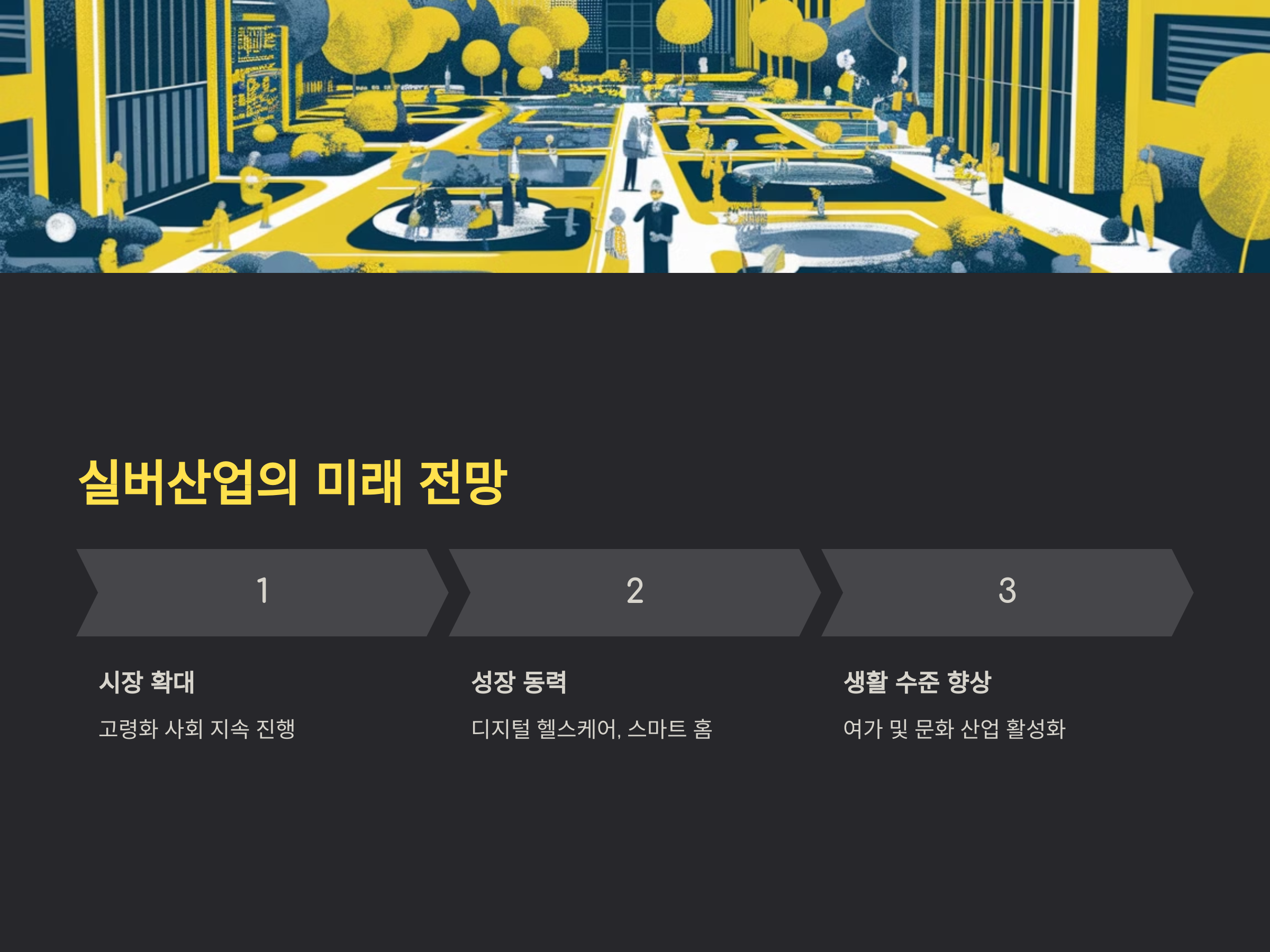실버산업의 미래는 매우 밝습니다. 고령화 사회가 계속해서 진행될수록 실버산업의 시장은 더욱 커질 것입니다. 특히, 디지털 헬스케어, 스마트 홈 기술, 로봇 기술 등이 실버산업의 주요 성장 동력으로 작용할 것입니다. 또한, 고령층의 생활 수준이 향상됨에 따라 다양한 여가 및 문화 산업도 활성화될 것으로 보입니다.