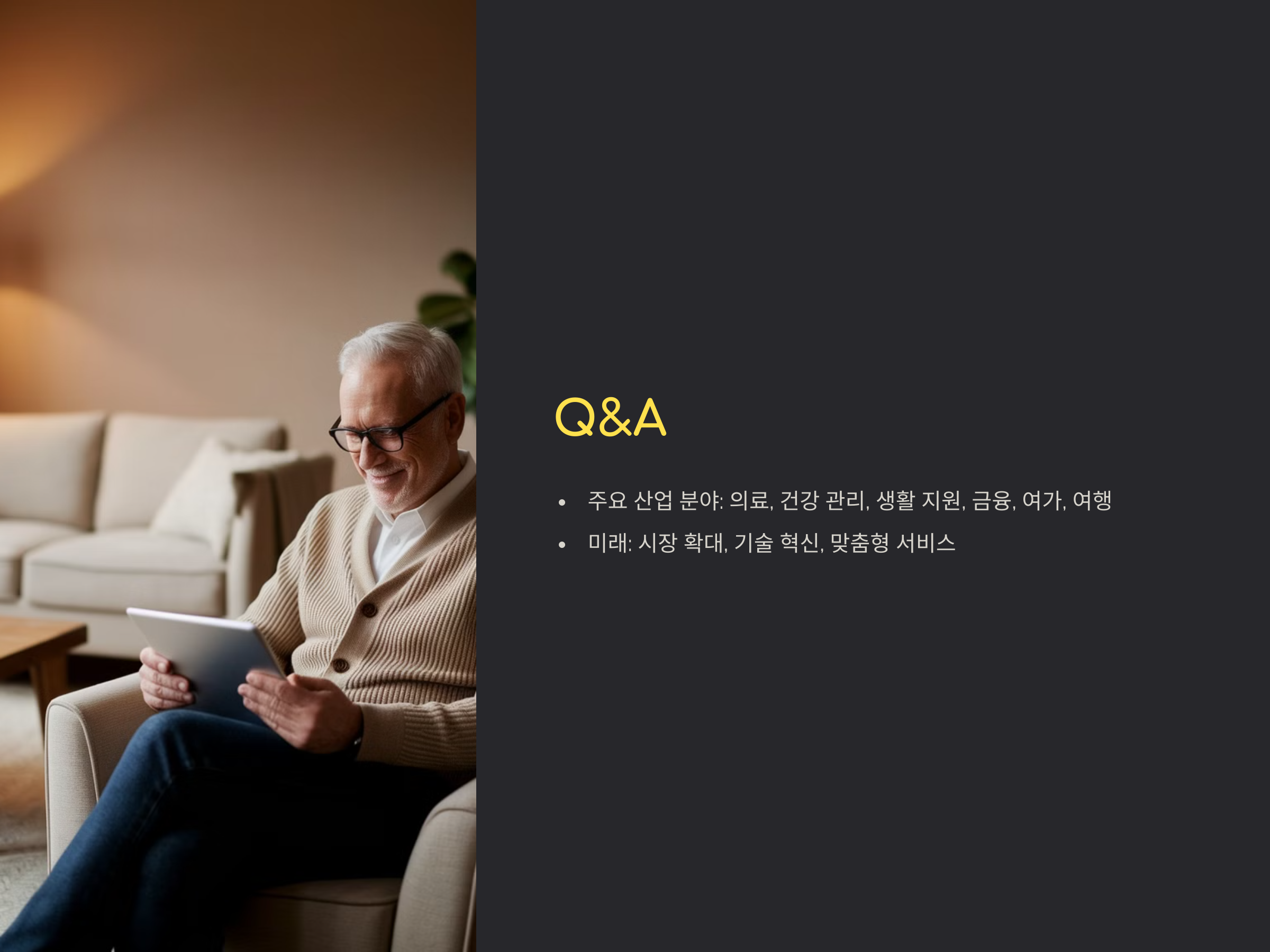 실버산업은 주로 의료, 건강 관리, 생활 지원, 금융, 여가 및 여행 분야에서 활발히 성장하고 있습니다.
