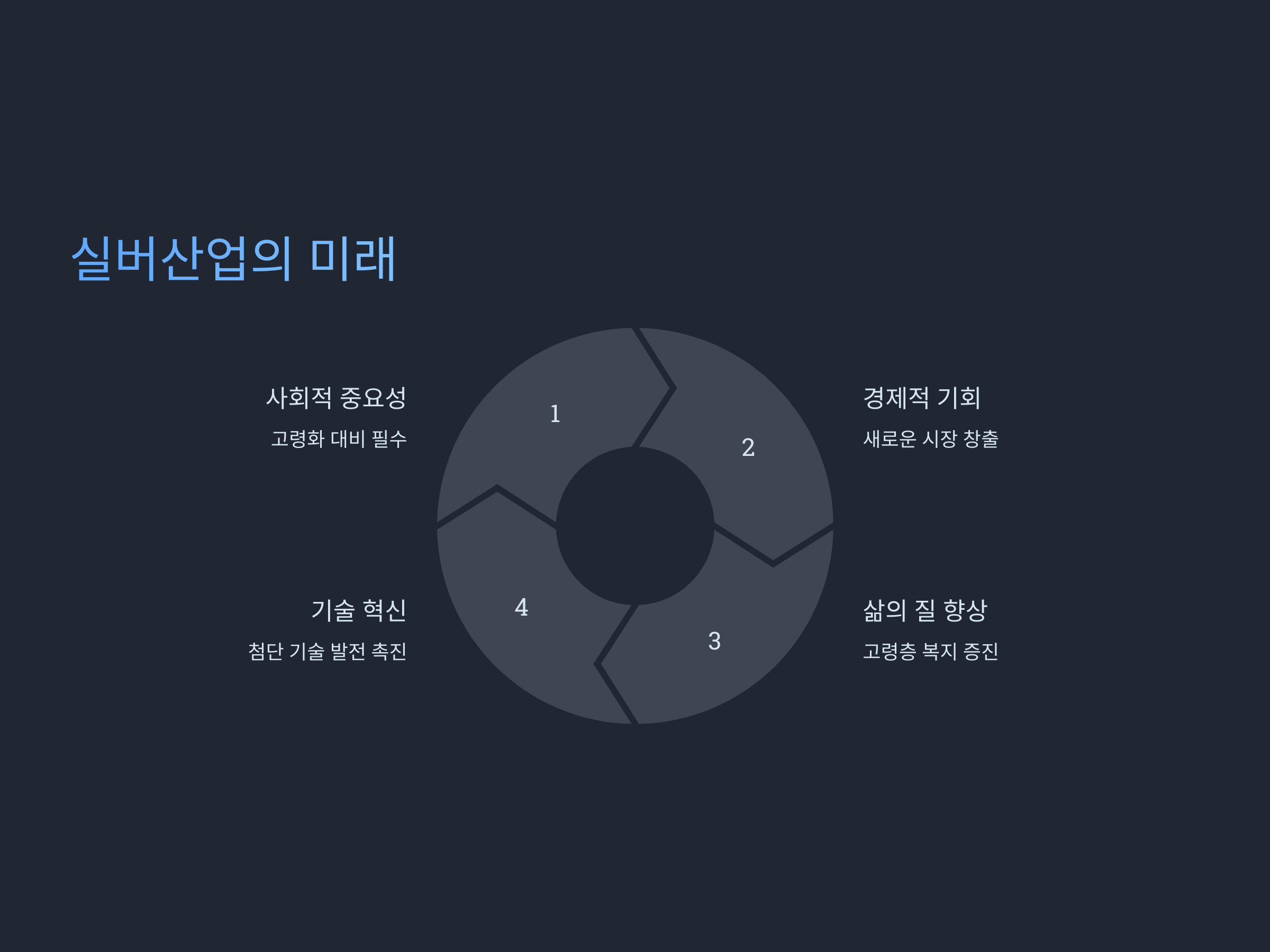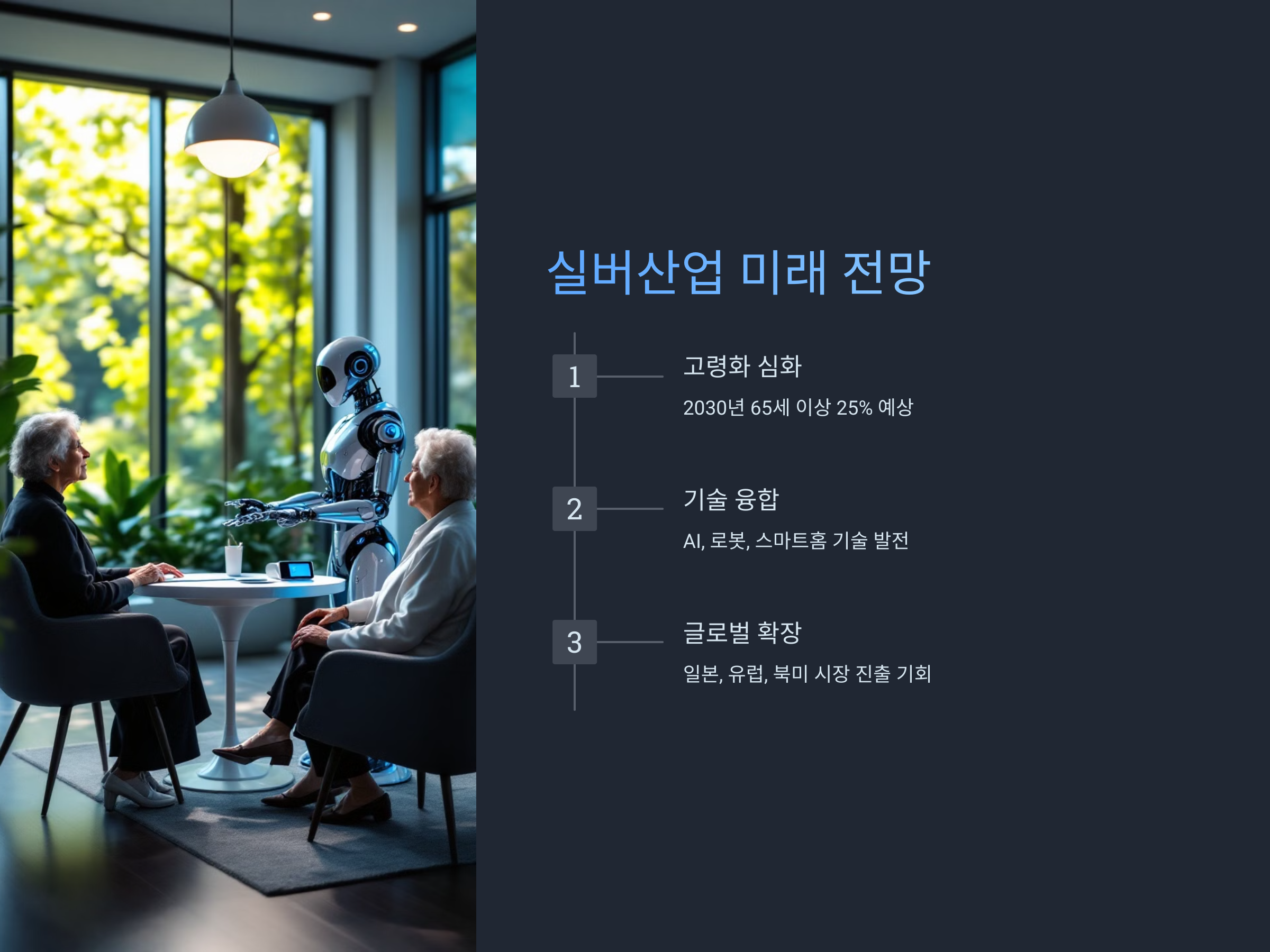 - 기술 혁신: AI, 로봇 기술, 헬스케어 기술 등의 발전은 고령층의 삶의 질을 높이고, 실버산업의 시장 규모를 확장시키는 역할을 하고 있습니다. 특히 헬스케어 분야에서 IoT(사물인터넷)와 스마트 기술의 접목은 고령자의 건강 관리에 혁신적인 변화를 가져왔습니다.