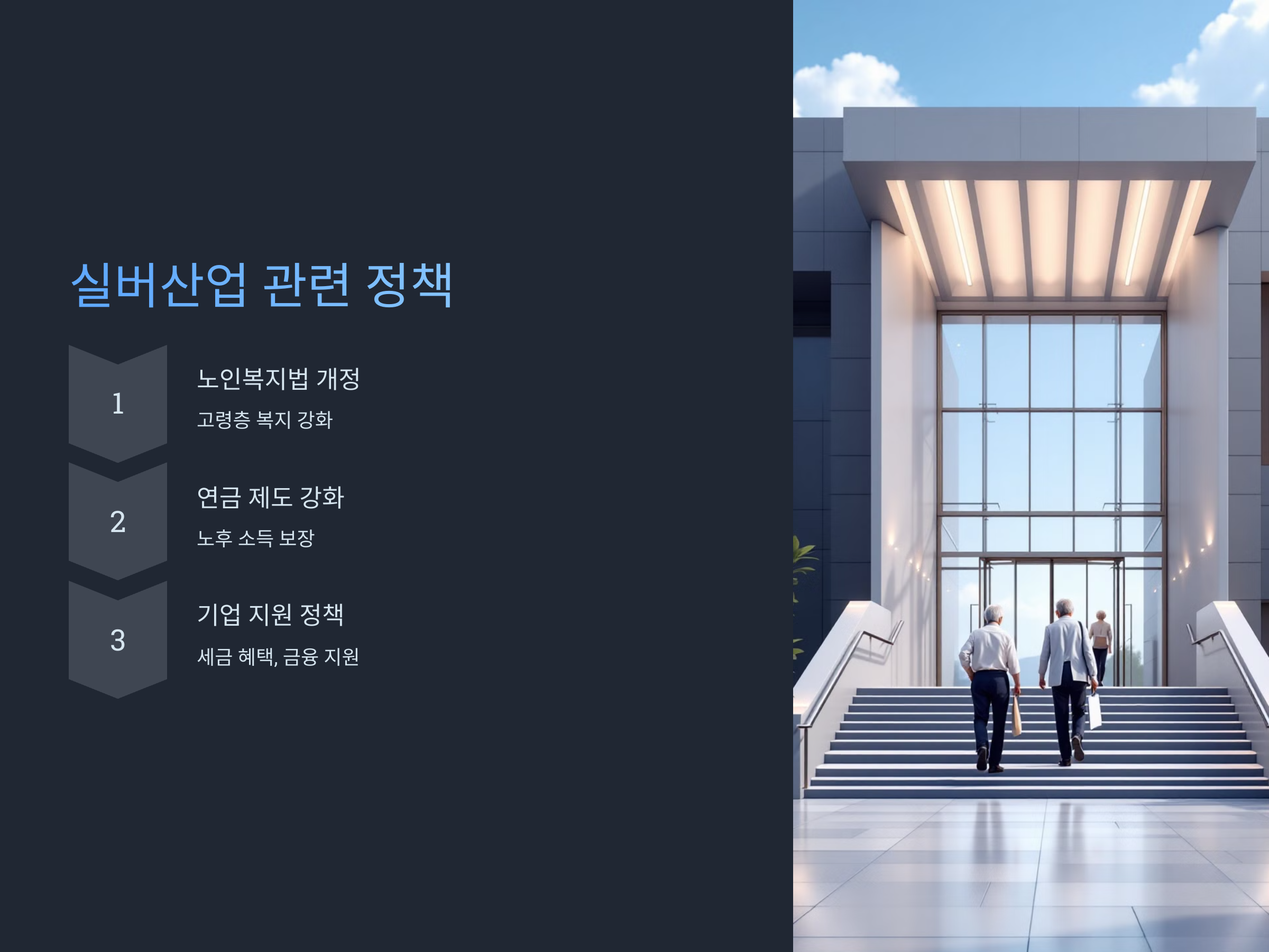 정부는 고령화 사회에 대응하기 위해 다양한 정책을 시행하고 있습니다. 노인복지법의 개정, 연금 제도의 강화, 고령층을 위한 다양한 사회적 지원 시스템 등이 그 예입니다. 이러한 정책들은 실버산업의 발전과 밀접하게 연관되어 있으며, 고령층의 삶의 질을 높이는 데 중요한 역할을 하고 있습니다.