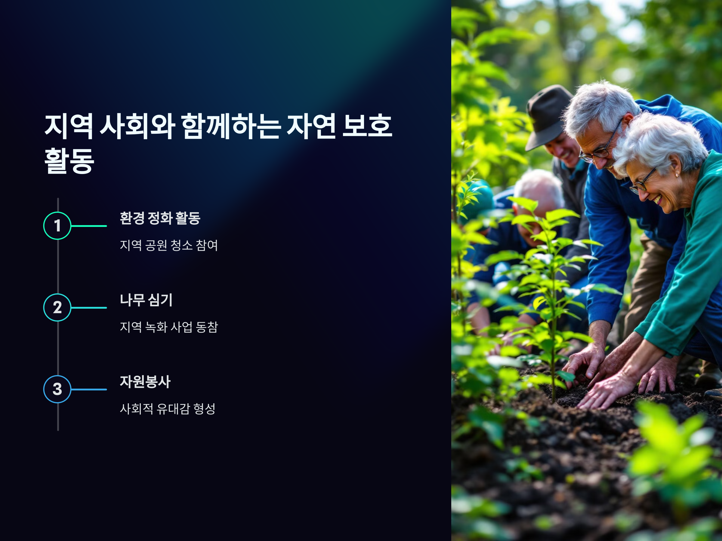 자연 친화적인 생활 방식을 실천하는 것뿐만 아니라, 지역 사회와 함께 자연 보호 활동에 참여하는 것도 좋은 방법입니다. 실버 세대는 많은 경험을 가지고 있기 때문에, 지역 사회에서 환경 보호 활동에 참여하거나 자원봉사를 할 수 있습니다. 예를 들어, 환경 정화 활동이나 나무 심기 등의 활동에 참여하면서 자연을 보호하고, 동시에 사회적 유대감을 형성할 수 있습니다.