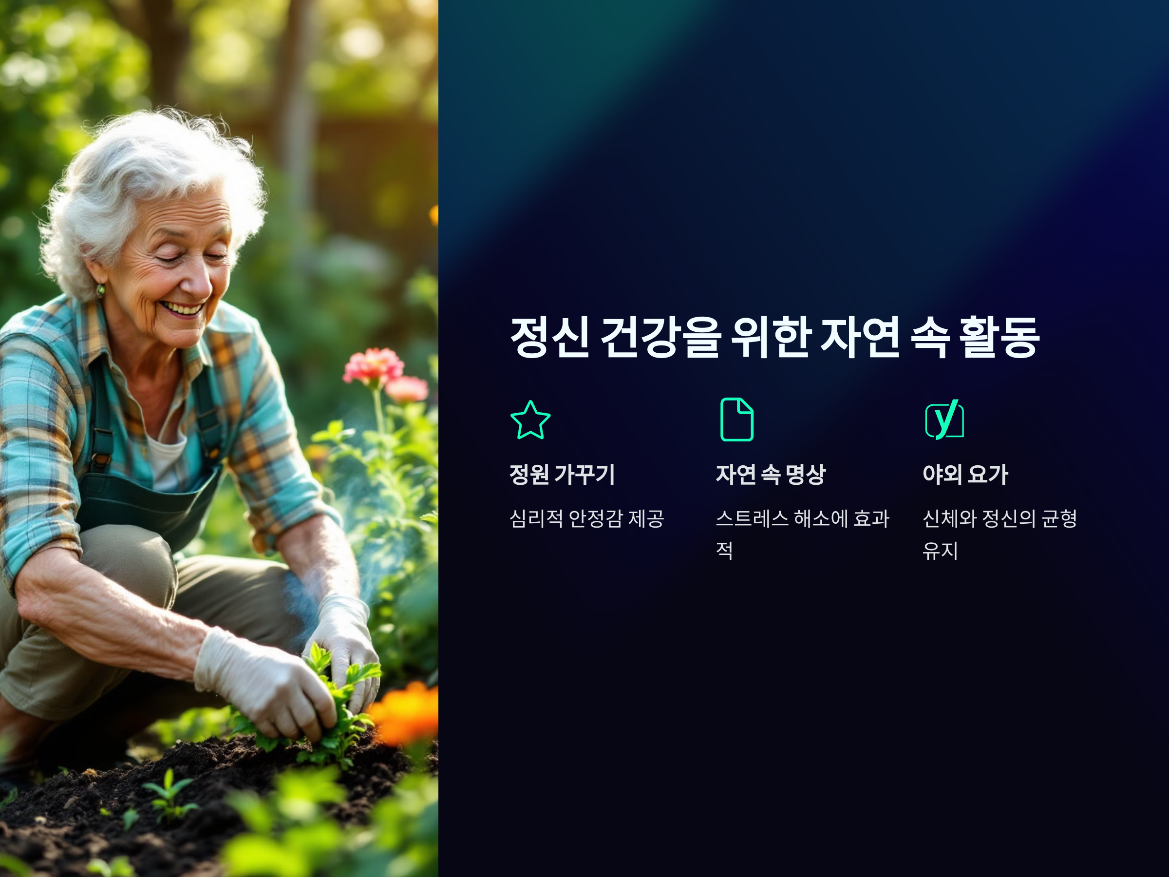 자연 속에서 시간을 보내는 것만큼 정신 건강에 좋은 활동은 드뭅니다. 실버 세대는 시간이 많기 때문에 자연 속에서 다양한 취미 활동을 할 수 있습니다. 예를 들어, 정원 가꾸기나 원예 활동은 심리적인 안정감을 줄 뿐만 아니라, 신체 활동에도 도움이 됩니다. 꽃과 나무를 돌보며 스트레스를 해소하고, 자연과의 연결을 느낄 수 있습니다. 또한, 자연 속에서 명상이나 요가를 하는 것도 매우 유익합니다.