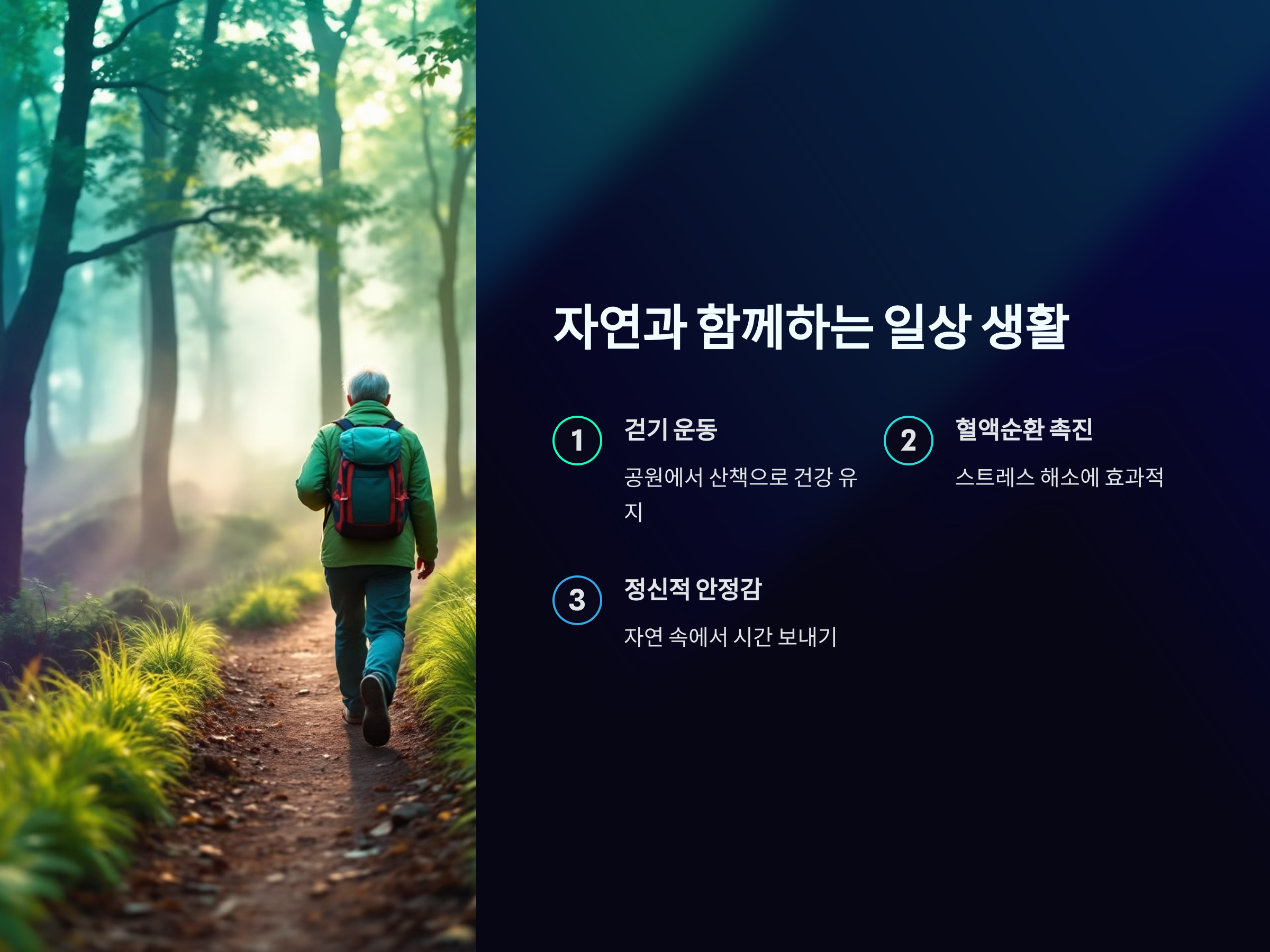 자연 친화적인 생활 방식은 단순히 환경을 생각하는 것만이 아니라, 개인의 건강과 행복에도 큰 영향을 미칩니다. 실버 세대가 자연을 가까이할 수 있는 방법 중 하나는 '걷기'입니다. 아침이나 저녁에 가까운 공원에서 산책을 하는 것만으로도 건강을 유지하는 데 큰 도움이 됩니다. 걷기 운동은 혈액순환을 촉진하고, 스트레스를 해소하는 데 효과적입니다. 또한, 자연 속에서 시간을 보내면 정신적으로도 안정감을 느낄 수 있습니다.