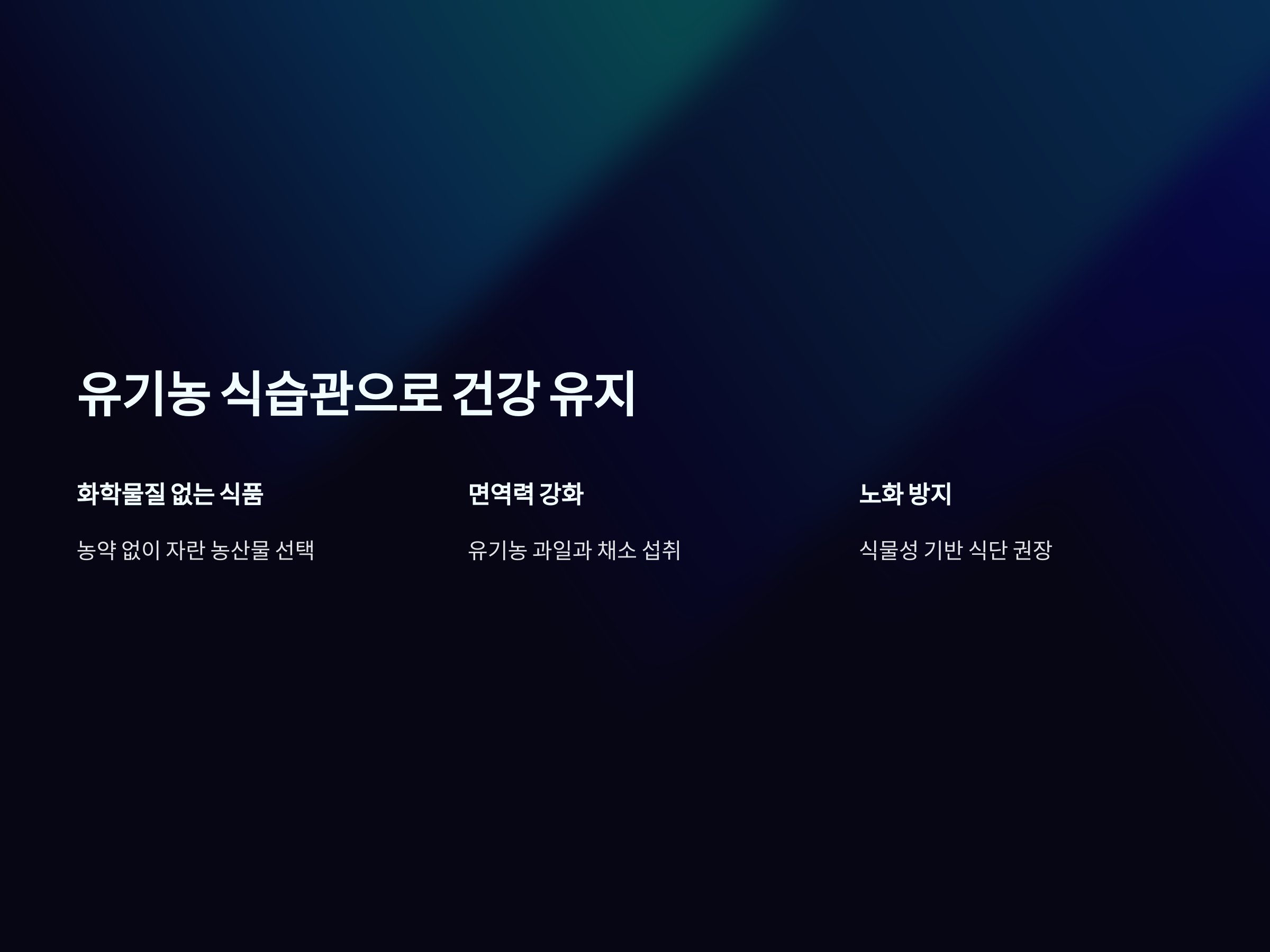 유기농 식품은 화학 비료나 농약 없이 자란 농산물로, 실버 세대에게 더욱 권장되는 선택입니다. 유기농 식품을 섭취하면 불필요한 화학 물질을 피할 수 있으며, 자연에서 자란 농산물이 가진 영양소를 그대로 흡수할 수 있습니다. 실버 세대는 신체의 면역력이 저하되기 쉬우므로, 유기농 과일과 채소를 적극적으로 섭취함으로써 건강을 유지할 수 있습니다. 또한, 식물성 기반의 식단은 노화 방지에도 도움을 줄 수 있습니다.