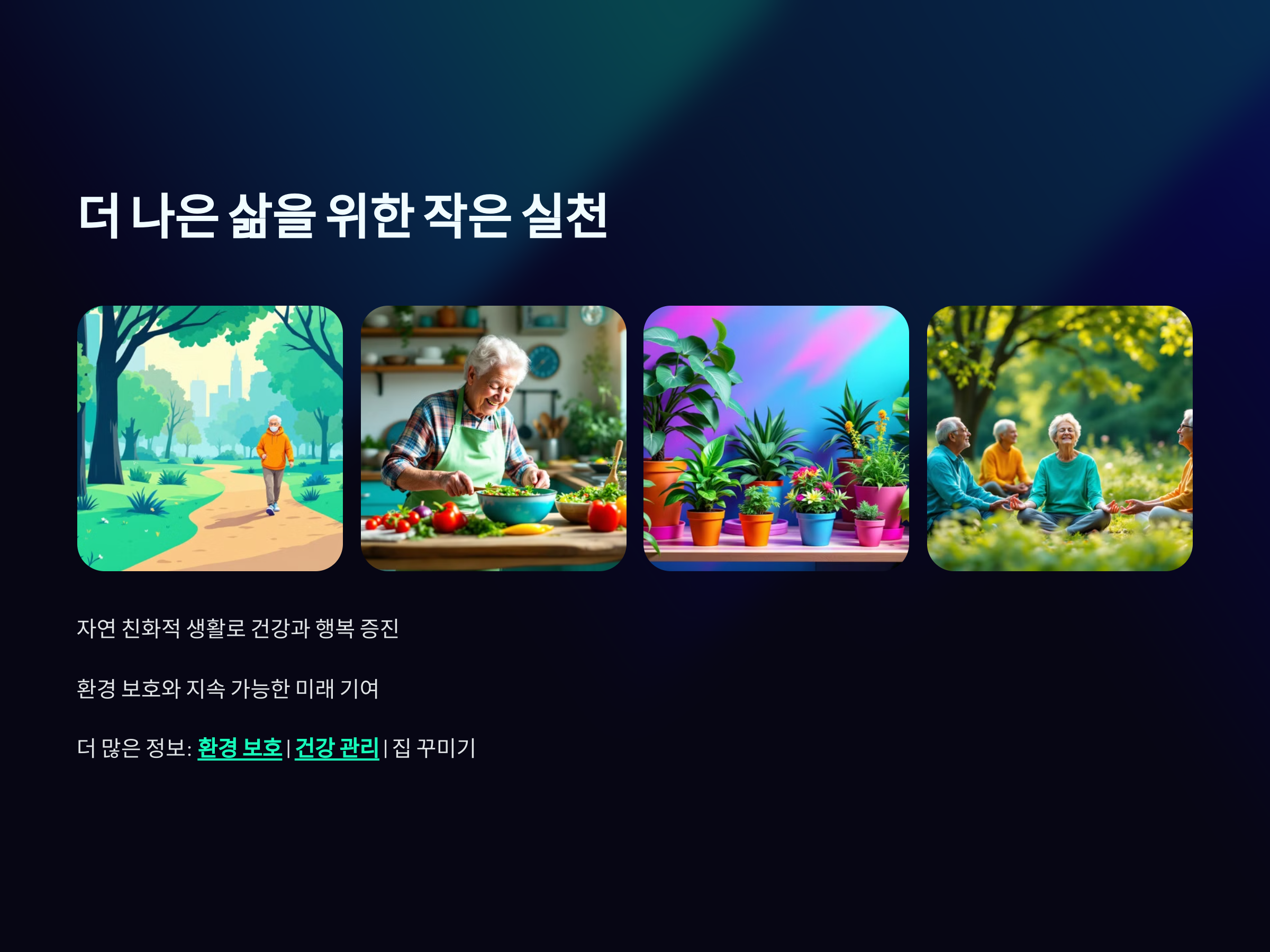 자연 친화적인 생활 방식은 실버 세대에게 건강과 행복을 증진시키는 중요한 요소입니다. 자연과 함께하는 삶은 신체적, 정신적 건강을 모두 증진시킬 수 있는 방법으로, 실버 세대가 실천하기에 적합합니다. 걷기, 유기농 식습관, 친환경적인 주거 공간, 자연 속 활동 등을 통해 실버 세대는 더 나은 삶을 살아갈 수 있습니다. 이러한 생활 방식은 환경을 보호하는 것뿐만 아니라, 지속 가능한 미래를 위한 작은 실천이기도 합니다.