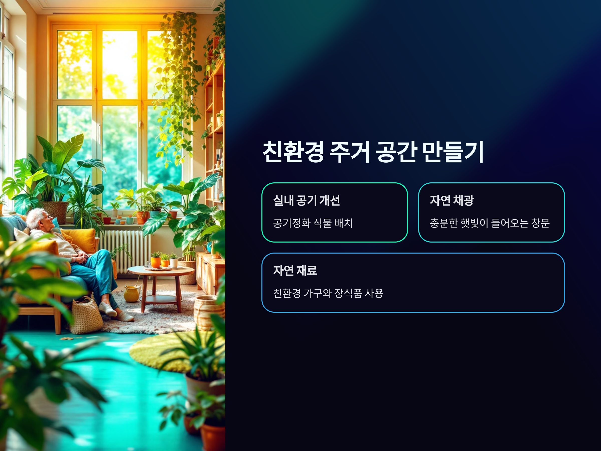 실버 세대를 위한 자연 친화적인 생활 방식은 주거 공간에도 적용할 수 있습니다. 친환경적인 집을 만드는 것은 환경을 보호하는 것뿐만 아니라 건강에도 유익합니다. 실내 공기 질을 개선하는 식물들을 배치하거나, 자연 채광을 충분히 받을 수 있는 창을 설계하는 것 등이 좋은 예입니다. 또한, 자연 재료로 만든 가구나 장식품을 사용하면 실내 환경을 더 건강하게 만들 수 있습니다.