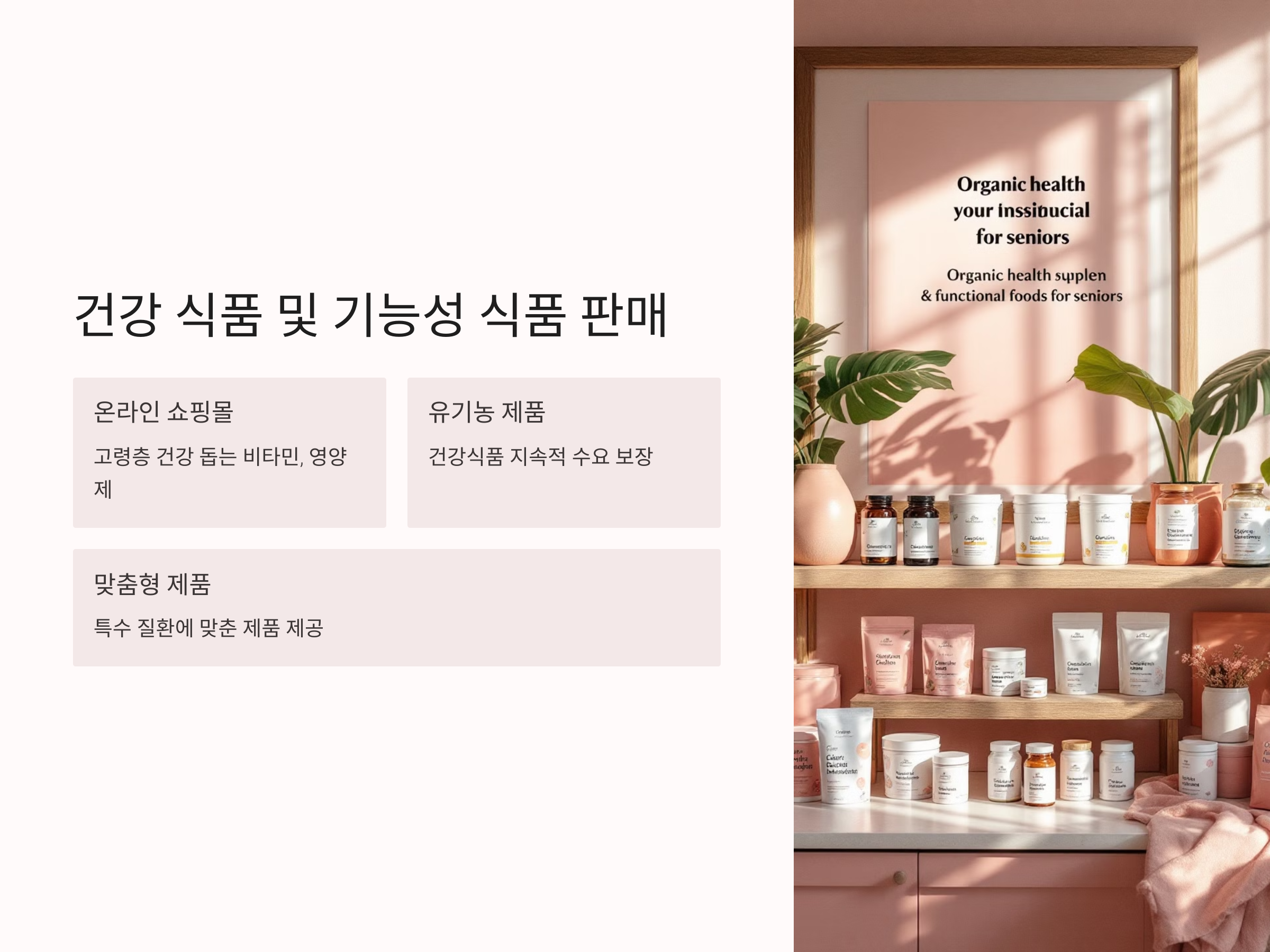 건강을 중시하는 실버 세대를 위해 기능성 식품을 판매하는 온라인 쇼핑몰을 운영하는 것도 큰 잠재력을 가진 창업 아이템입니다. 특히, 고령층의 건강을 돕는 다양한 비타민, 영양제, 건강식품을 제공하는 서비스는 지속적인 수요를 보장합니다. 유기농 제품이나 특수한 질환에 맞춘 맞춤형 제품을 제공하면 더 많은 관심을 끌 수 있습니다.