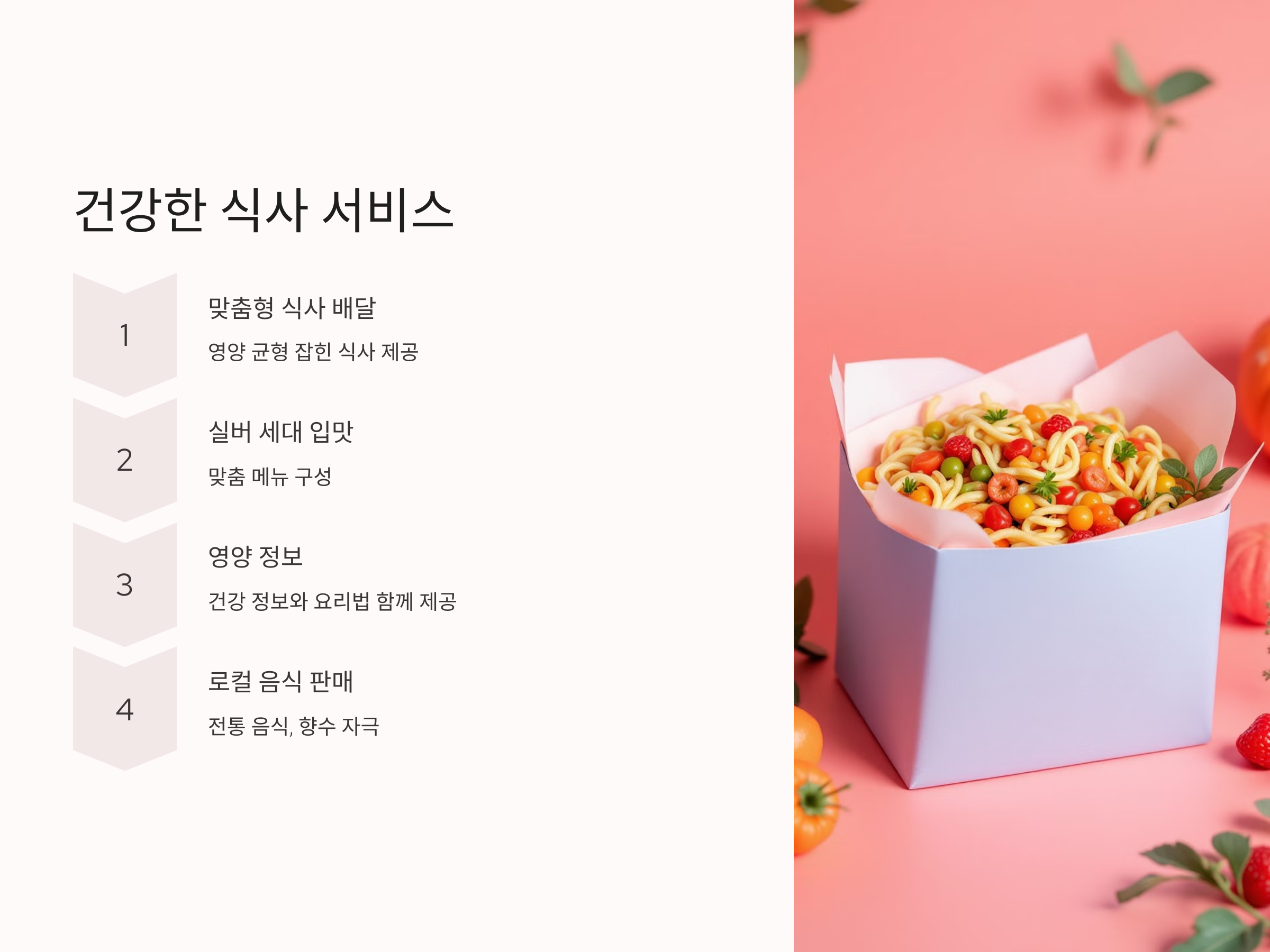 실버 세대는 건강한 식사를 원하면서도 스스로 음식을 준비하는 데 어려움을 겪을 수 있습니다. 따라서 맞춤형 식사 배달 서비스는 매우 인기 있는 창업 아이템입니다. 영양학적으로 균형 잡힌 식사를 제공하고, 실버 세대의 입맛에 맞는 메뉴를 제공하는 것이 중요합니다. 또한, 식사 배달 외에도 간단한 요리법이나 영양 정보를 함께 제공하면 더욱 큰 인기를 끌 수 있습니다.