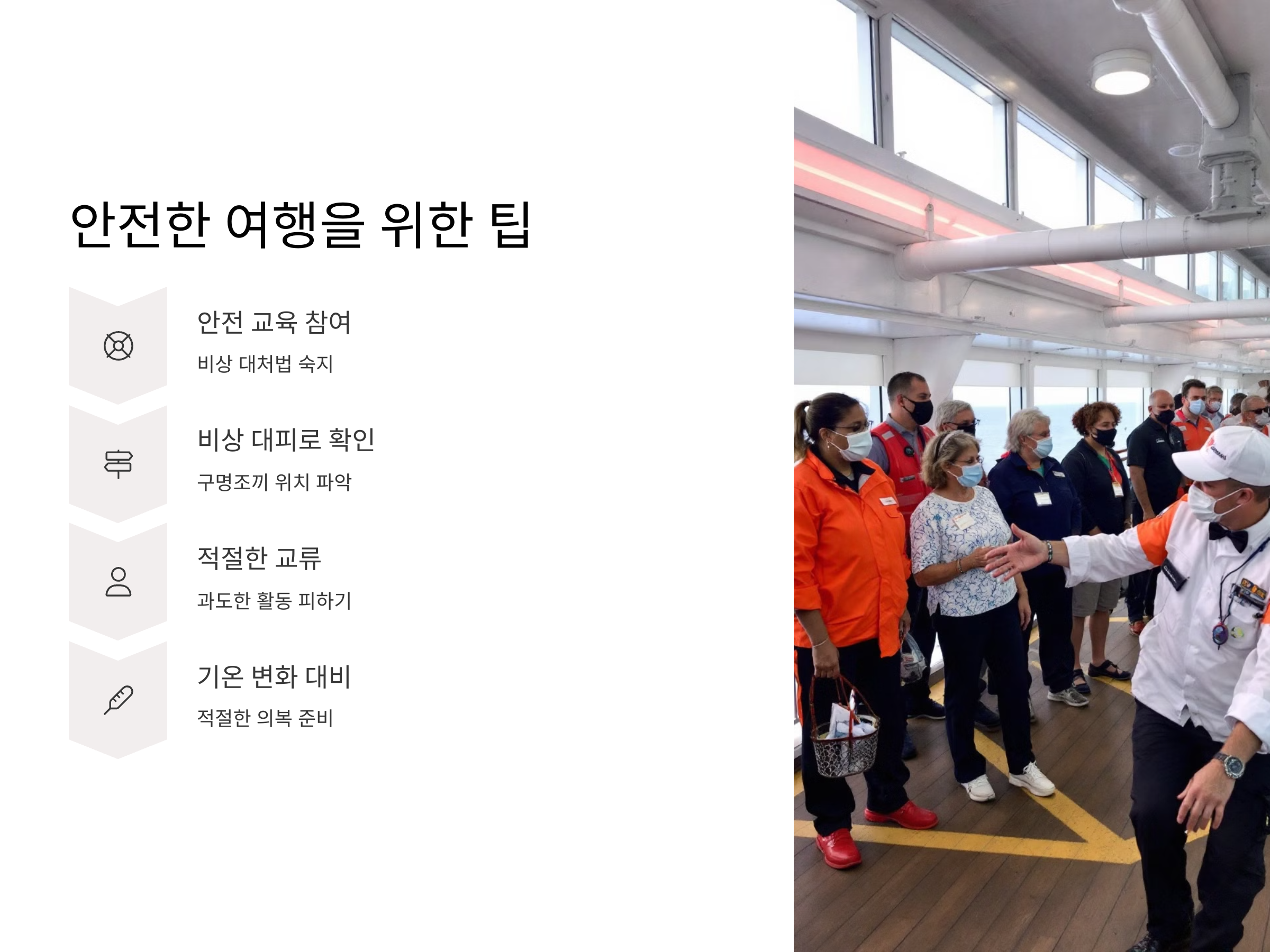크루즈 여행 중 안전은 가장 중요한 요소입니다. 실버 세대는 이동에 불편함이 있을 수 있고, 일부 크루즈 선박에서는 급격한 기온 변화나 갑작스러운 바다 상태 변화가 있을 수 있습니다. 따라서 여행 중에는 안전을 최우선으로 고려해야 합니다.