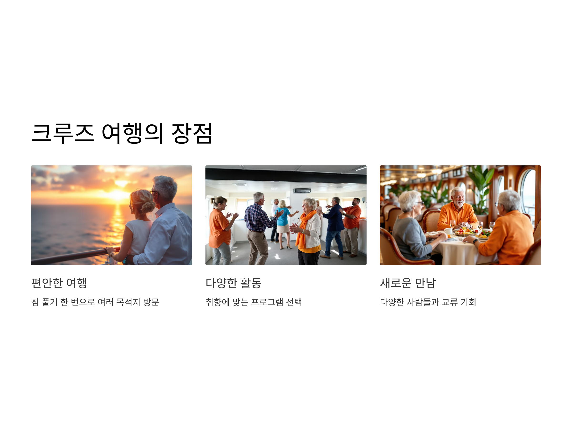 실버 세대가 크루즈 여행을 떠날 때 고려해야 할 사항은 건강 상태, 여행 목적지, 선박 시설, 그리고 안전 문제 등이 있습니다. 또한, 여행 일정과 예상 비용 등을 미리 파악하고, 여행 중 필요한 다양한 서비스를 준비하는 것도 중요합니다. 이번 글에서는 크루즈 여행을 떠나기 전에 꼭 체크해야 할 필수 항목과 준비물들에 대해 안내드리겠습니다.