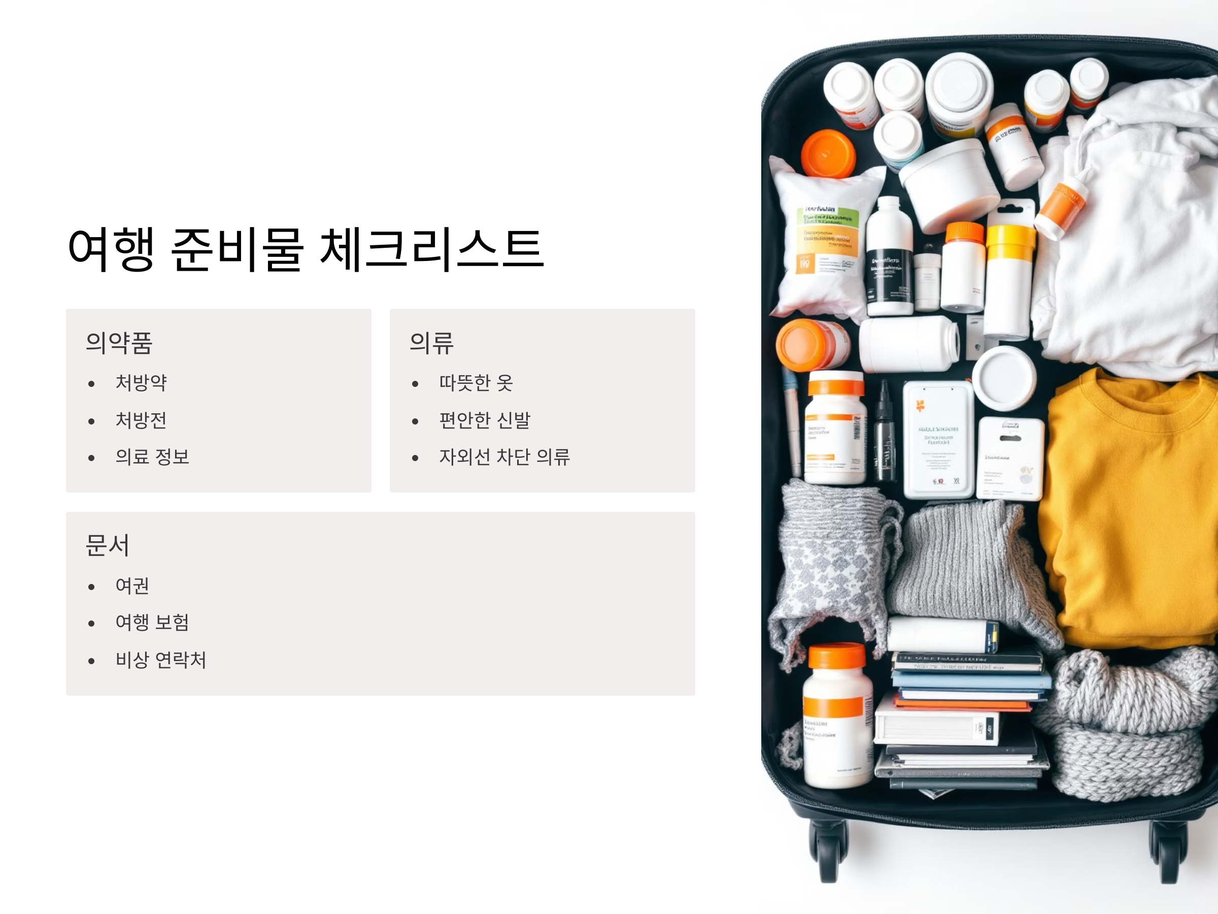 특히, 실버 세대는 의료적 문제나 긴급 상황에 대비하기 위해 처방약, 처방전, 의료 정보 등을 챙기는 것이 좋습니다. 그리고 크루즈 여행은 바다 위에서 진행되므로, 따뜻한 옷과 햇볕을 차단할 수 있는 의류도 준비하는 것이 필요합니다. 편안한 신발과 함께, 일상적인 용품 외에도 여행 중 불편함을 최소화할 수 있는 추가 용품들을 준비하세요.