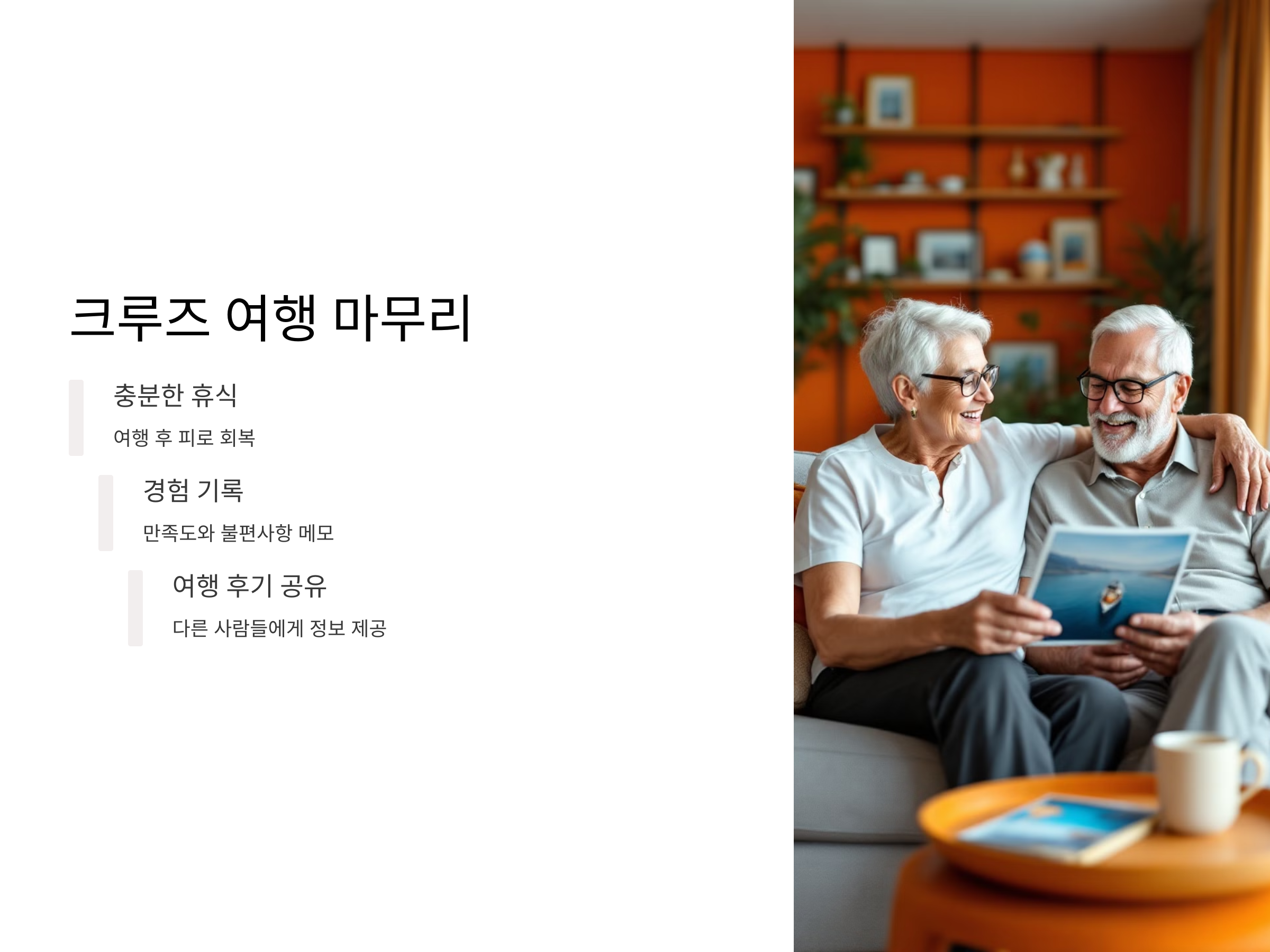 크루즈 여행이 끝난 후, 여행의 전체적인 경험을 평가하고 반성하는 시간은 매우 중요합니다. 실버 세대는 여행 중 편안한 여행을 즐기기 위해 여행 전, 중, 후에 충분한 휴식을 취하는 것이 중요합니다. 여행 후에는 숙면과 적절한 음식 섭취로 여행의 피로를 풀고, 여행에서 얻은 경험을 소중히 여겨야 합니다.
