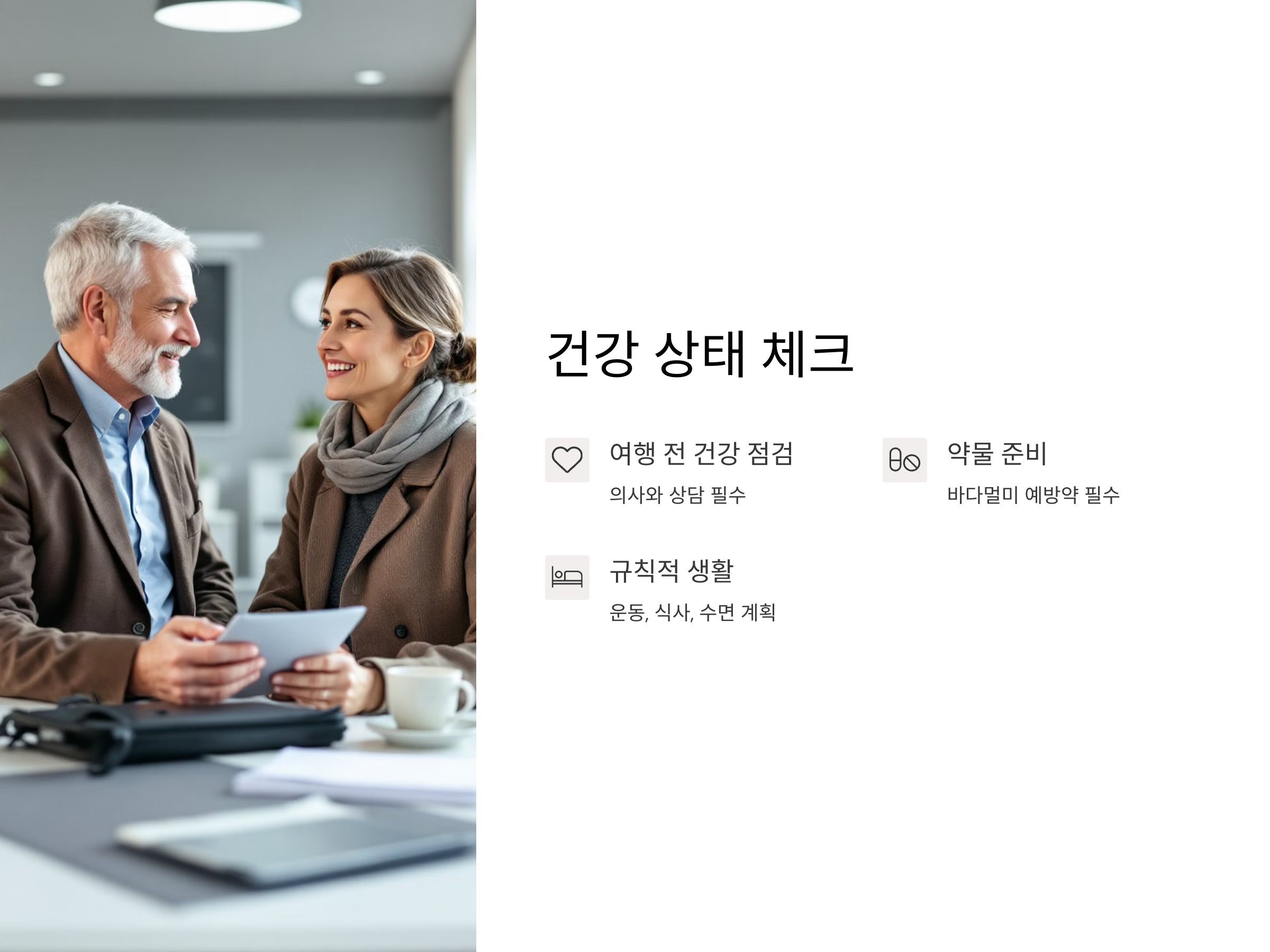 실버 세대가 크루즈 여행을 떠날 때 가장 중요한 점 중 하나는 건강 상태입니다. 크루즈 여행은 일반적으로 수일에서 수주에 걸쳐 진행되는 긴 여행이기 때문에, 여행 전에 건강 상태를 점검하는 것이 매우 중요합니다. 특히, 고혈압, 당뇨병, 심장 질환 등 만성질환이 있을 경우, 의사와 상담을 통해 여행의 적합성 여부를 확인하는 것이 좋습니다.