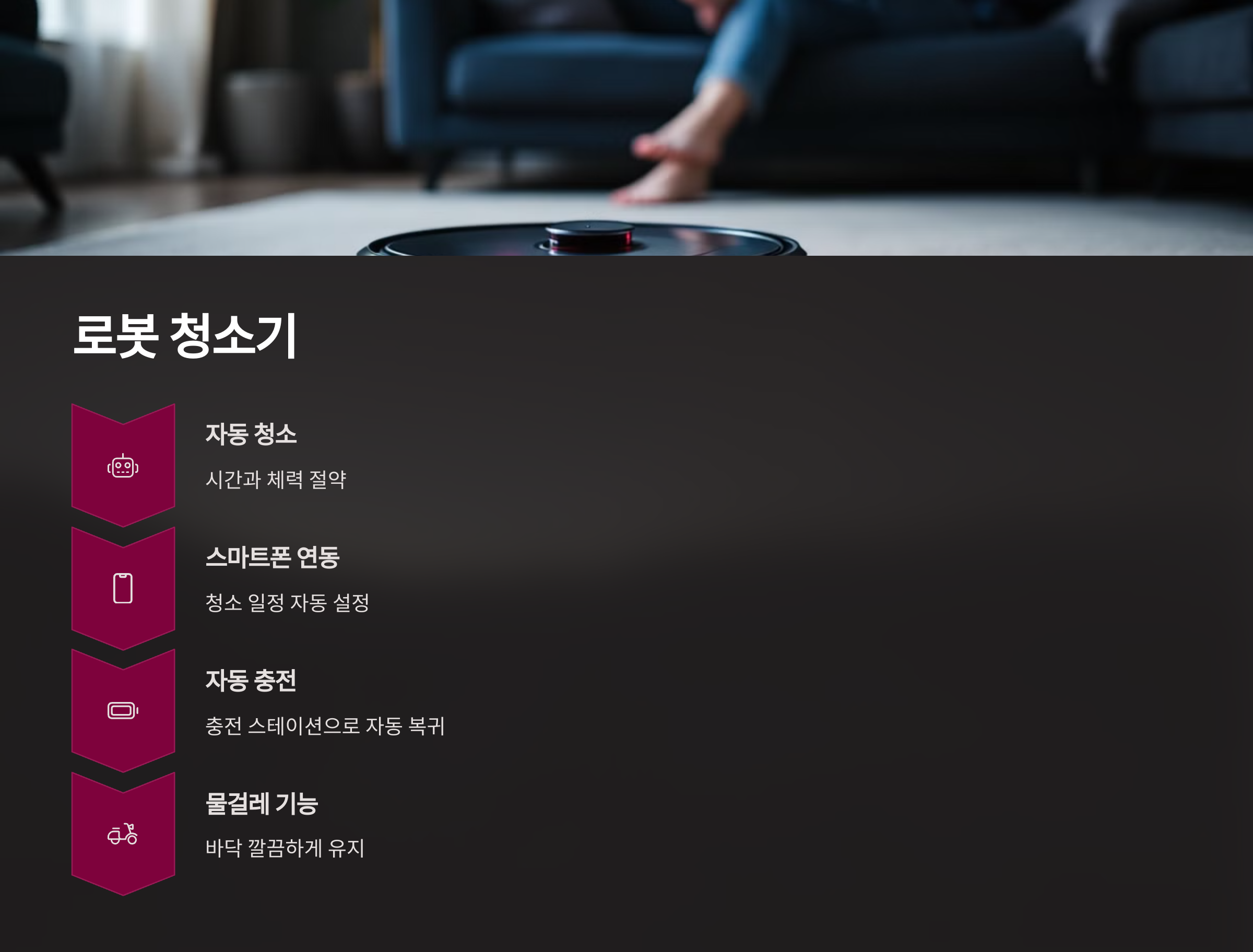 로봇 청소기의 큰 장점 중 하나는 '자동 충전' 기능입니다. 청소가 끝난 후, 자동으로 충전 스테이션으로 돌아가 충전할 수 있어 사용자가 신경 쓸 필요가 없습니다. 또한, 물걸레 청소 기능이 있는 모델도 있어 바닥을 깔끔하게 유지할 수 있습니다. 실버 세대는 이런 스마트한 기능 덕분에 체력 소모 없이 집을 청결하게 유지할 수 있습니다.