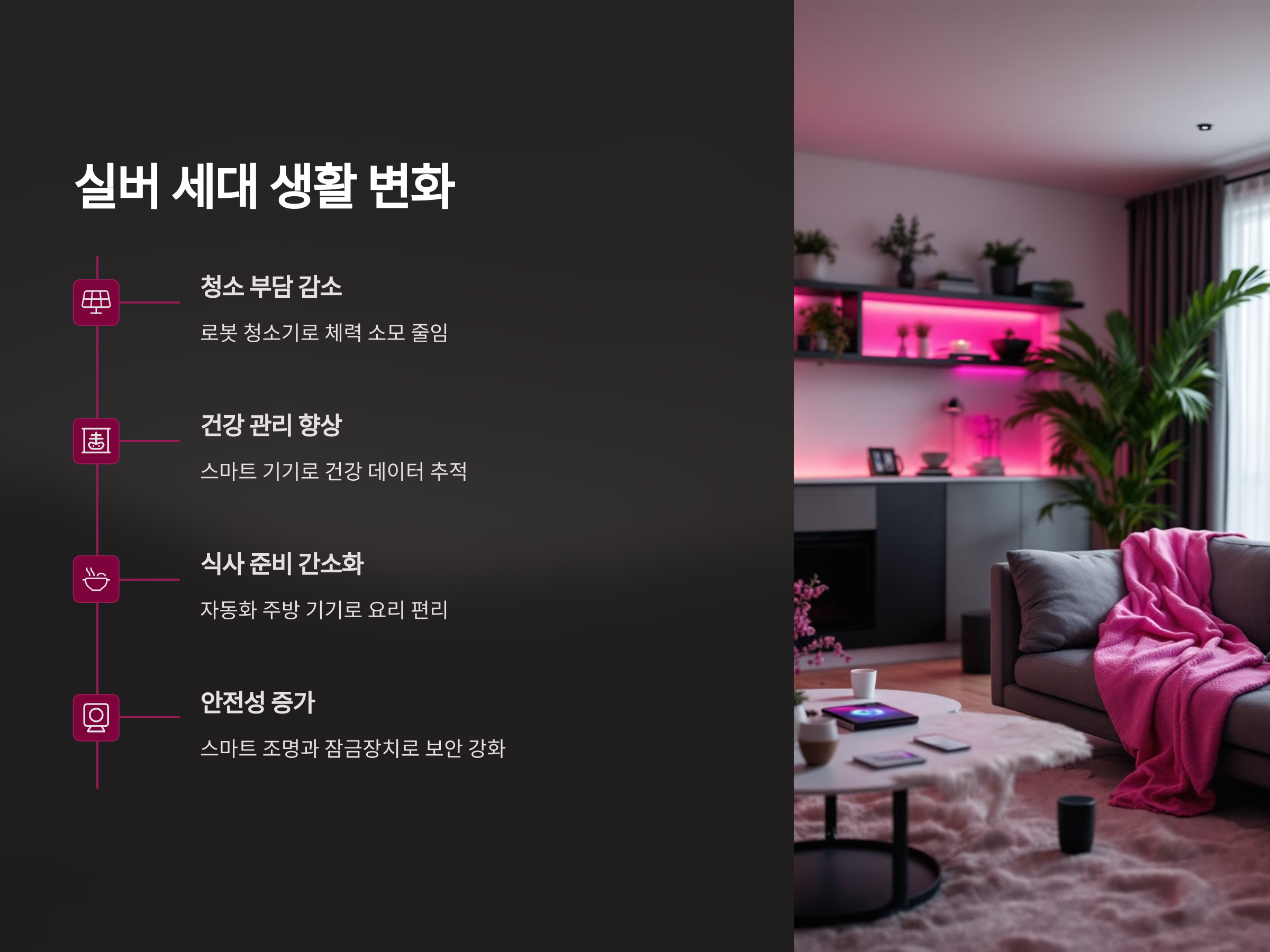 실버 세대에게는 스마트 조명 시스템이 매우 유용합니다. 이 시스템은 음성 명령이나 스마트폰 앱을 통해 조명을 제어할 수 있어, 집안 곳곳에서 불편함 없이 조명을 조절할 수 있습니다. 예를 들어, 침대에 누워서 스마트폰으로 조명을 끄거나, 일어나지 않고도 원하는 색온도나 밝기를 조정할 수 있습니다.