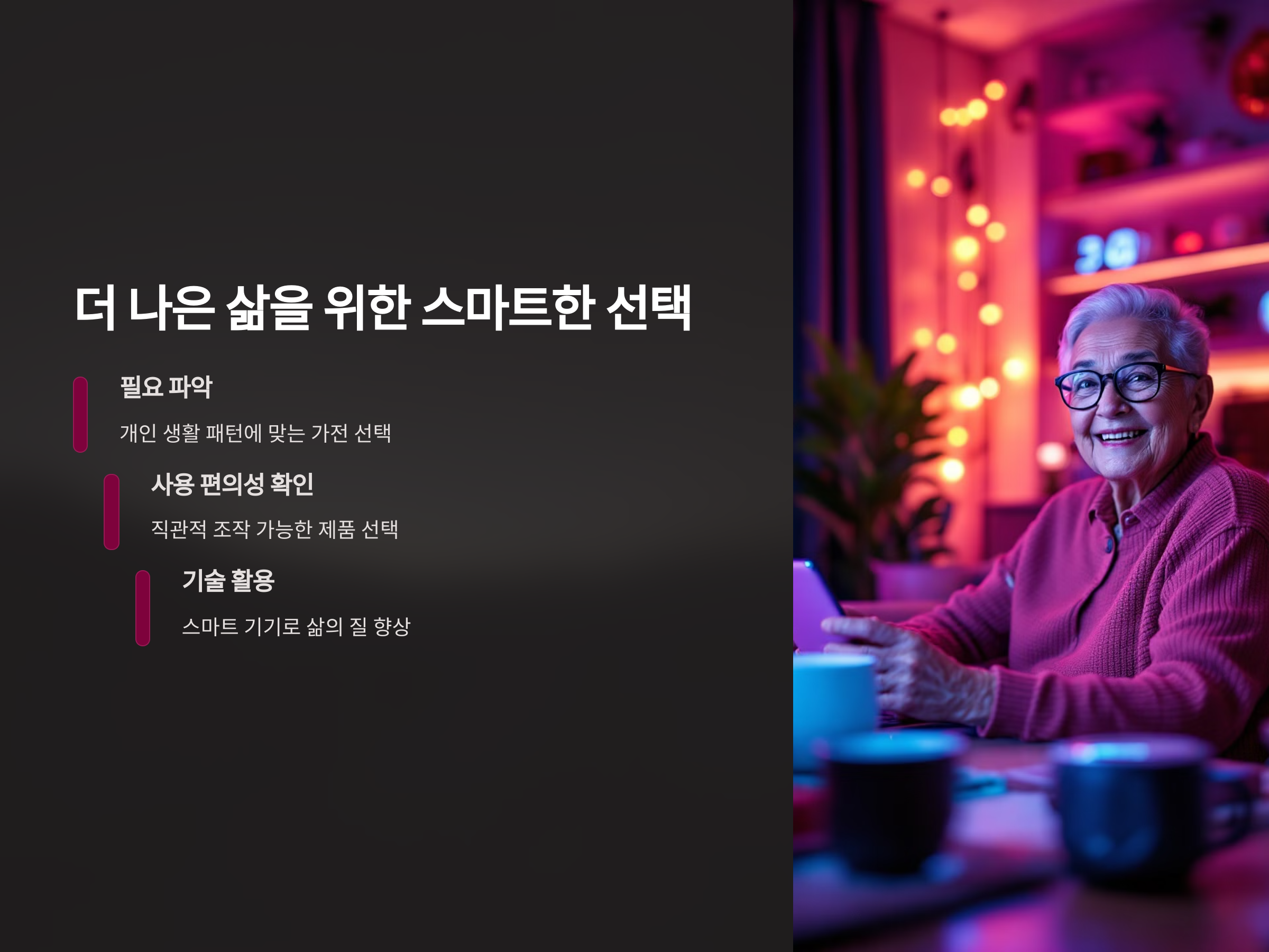 이제는 기술을 통해 더 나은 생활을 추구할 수 있는 시대입니다. 실버 세대가 이러한 가전제품들을 잘 활용하여, 더욱 편리하고 안전한 삶을 살기를 바랍니다.