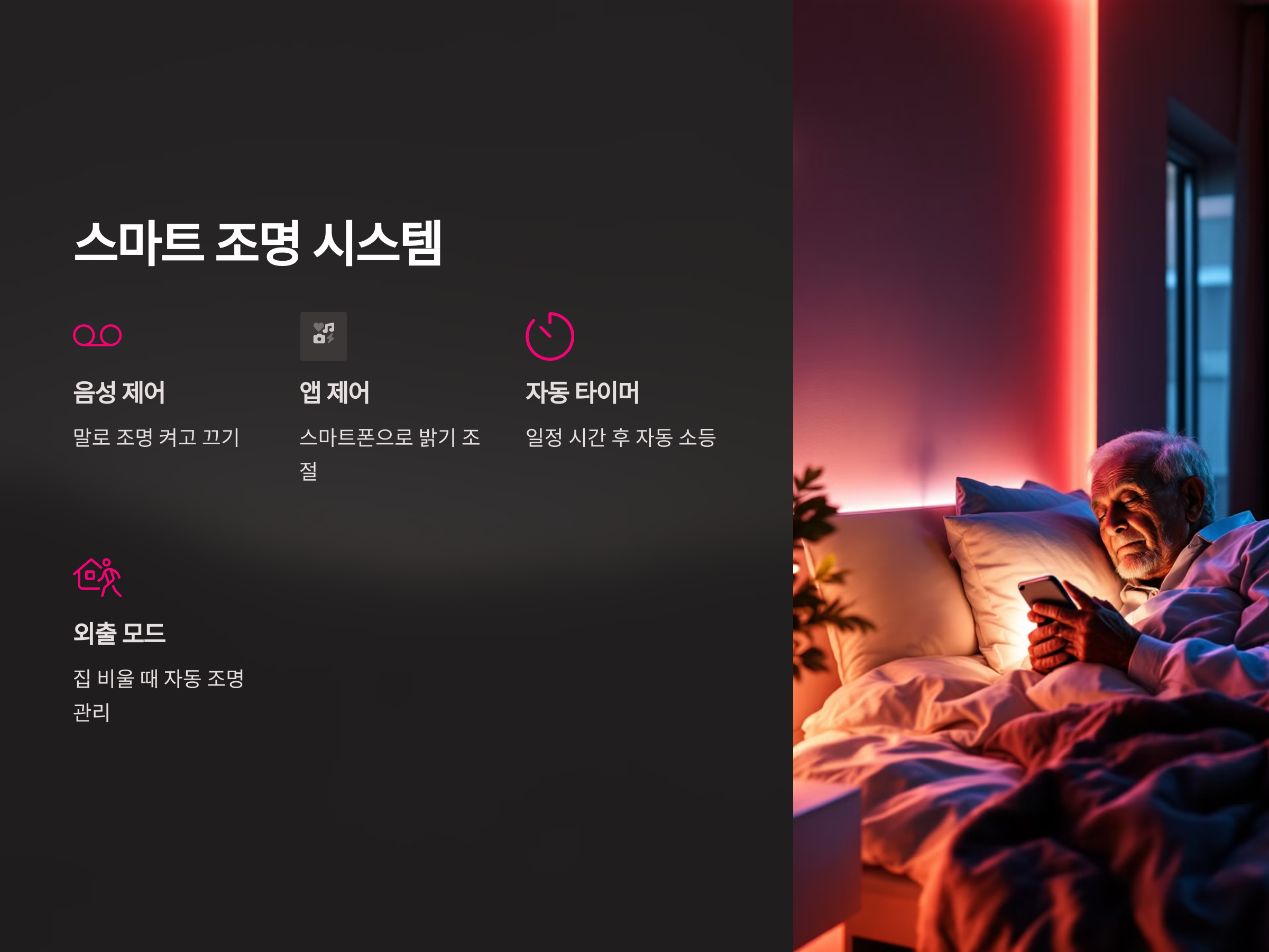 스마트 조명 시스템은 자동으로 일정 시간 후에 꺼지거나, 외출 모드를 설정하여 집을 비울 때도 자동으로 조명이 꺼지는 기능을 제공하기도 합니다. 이렇게 편리한 시스템을 통해 실버 세대는 더욱 안전하고 편리한 생활을 할 수 있습니다.