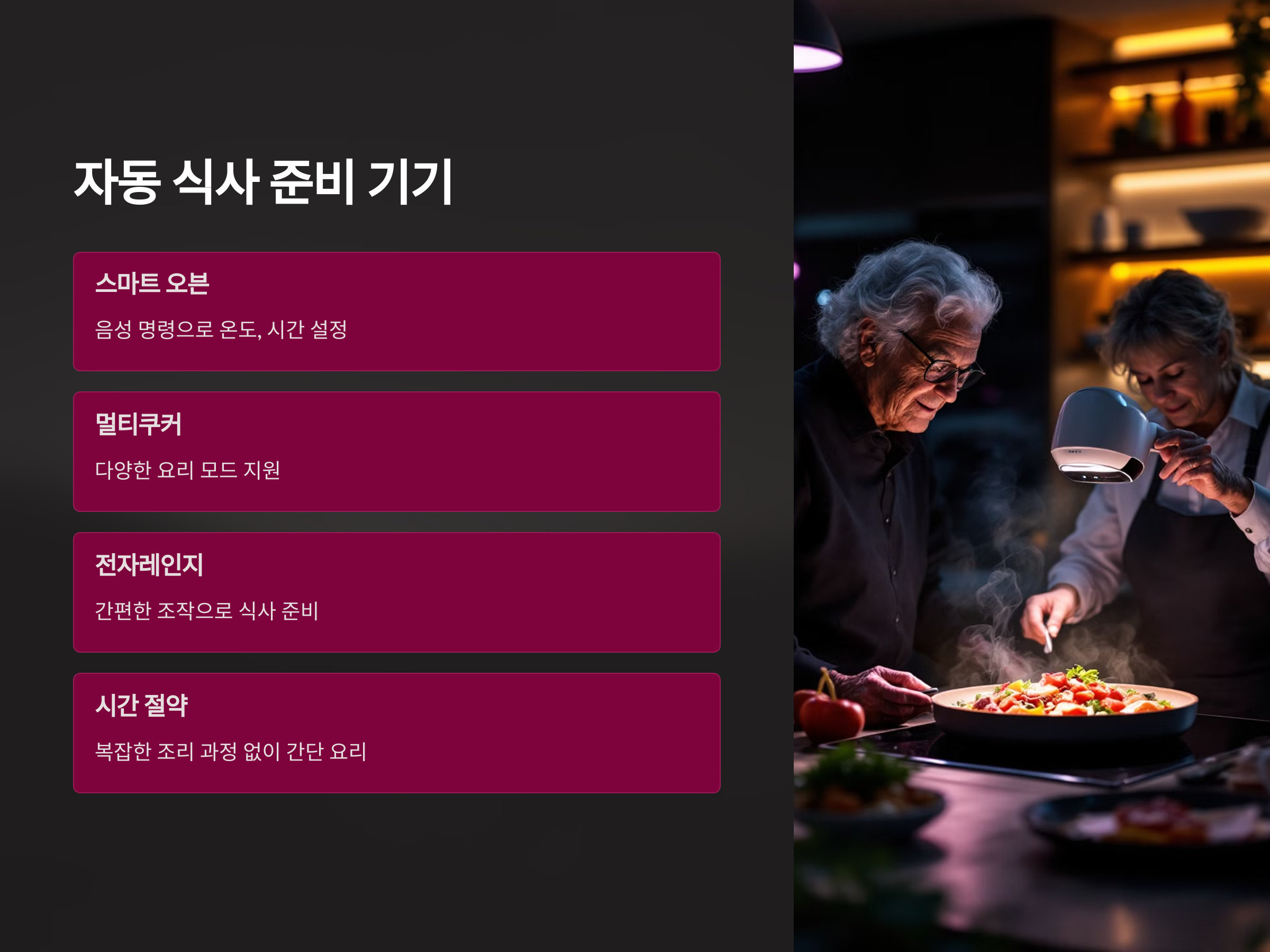 이와 같은 자동화된 주방 기기는 실버 세대에게 시간과 에너지를 절약해 주며, 자주 이용하는 식재료나 요리법을 기록하여 매일의 식사가 더 간편해질 수 있도록 돕습니다.