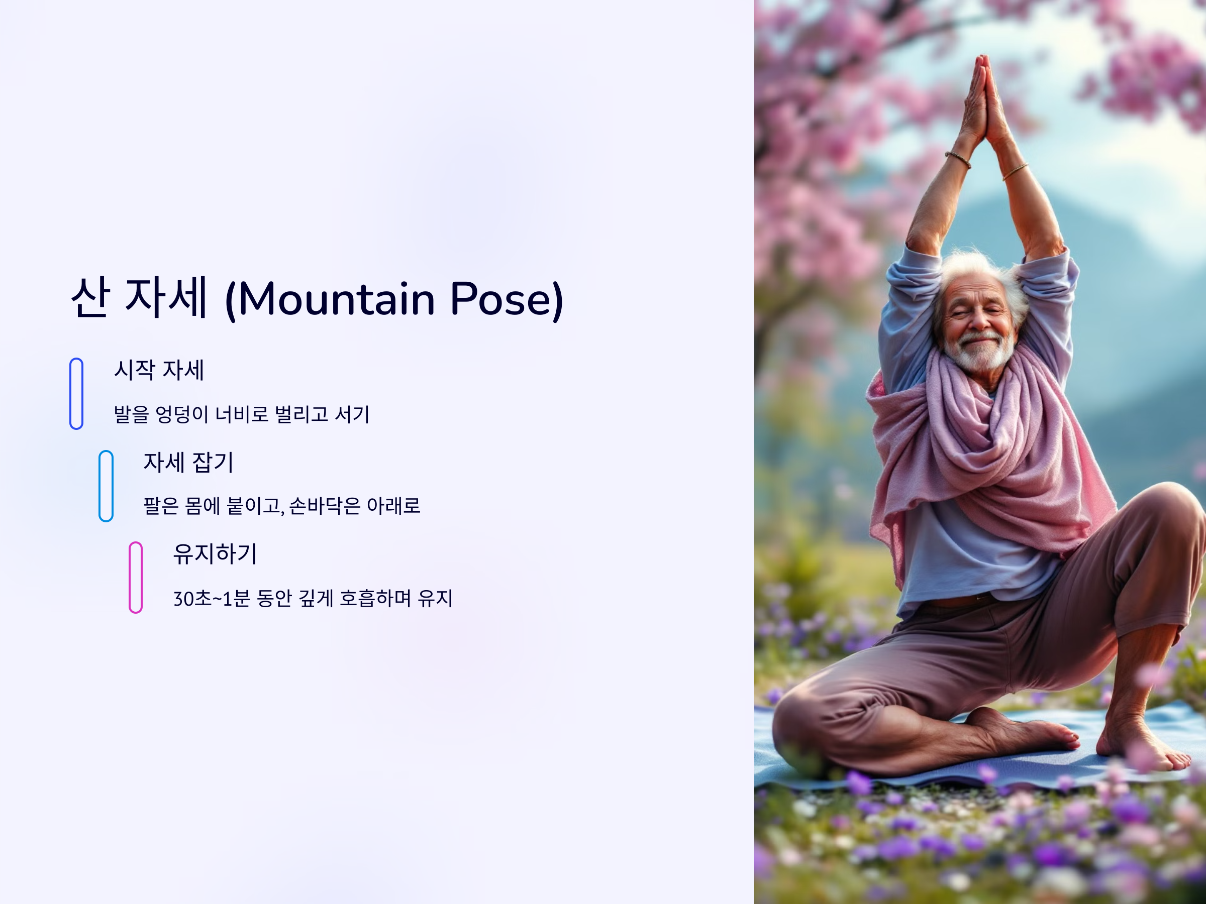 산 자세는 가장 기본적인 요가 자세로, 몸의 균형을 잡고 자세를 바로잡는 데 좋은 운동입니다. 이 동작은 심신을 안정시키고, 자세 교정에 효과적입니다.