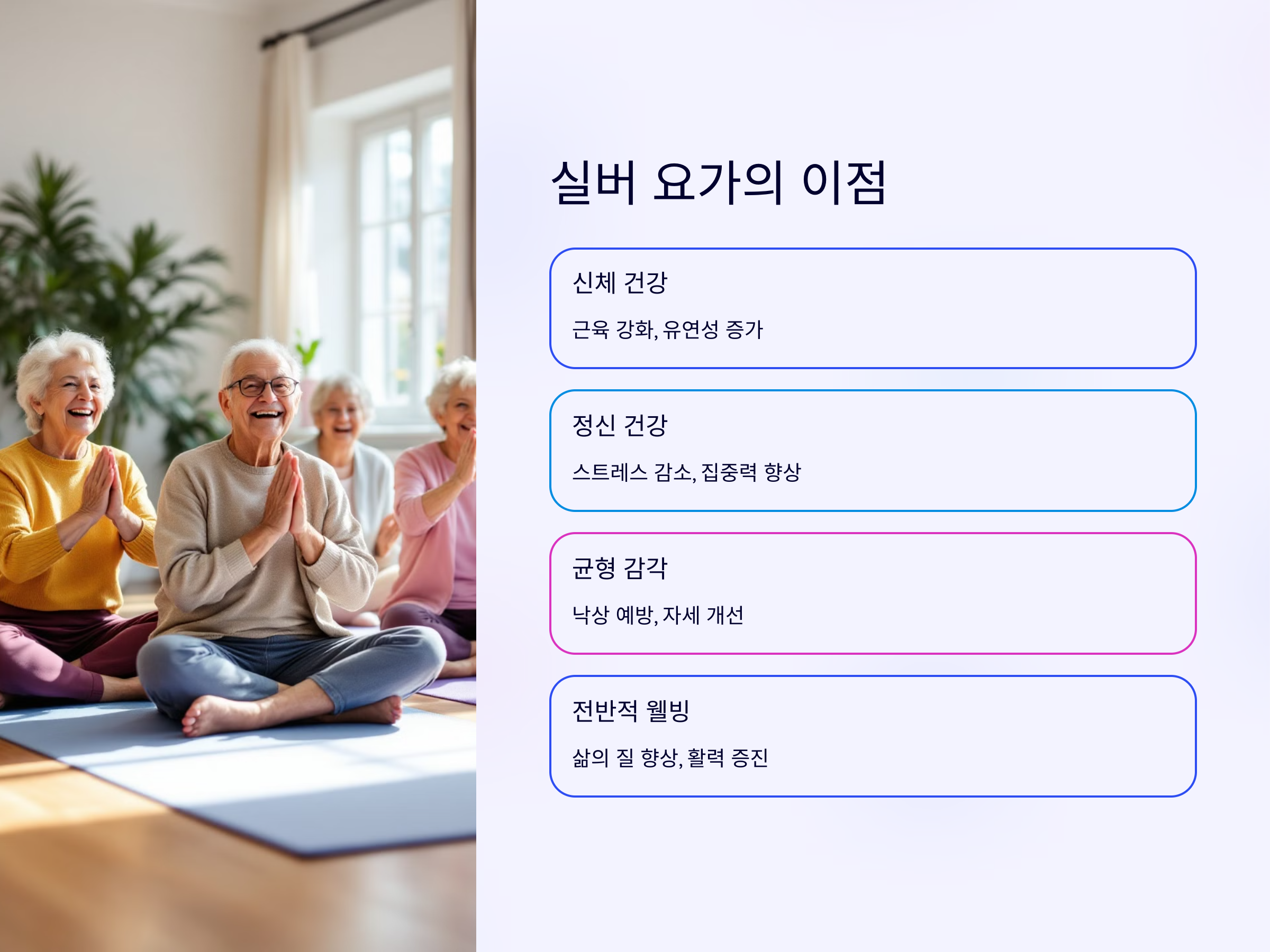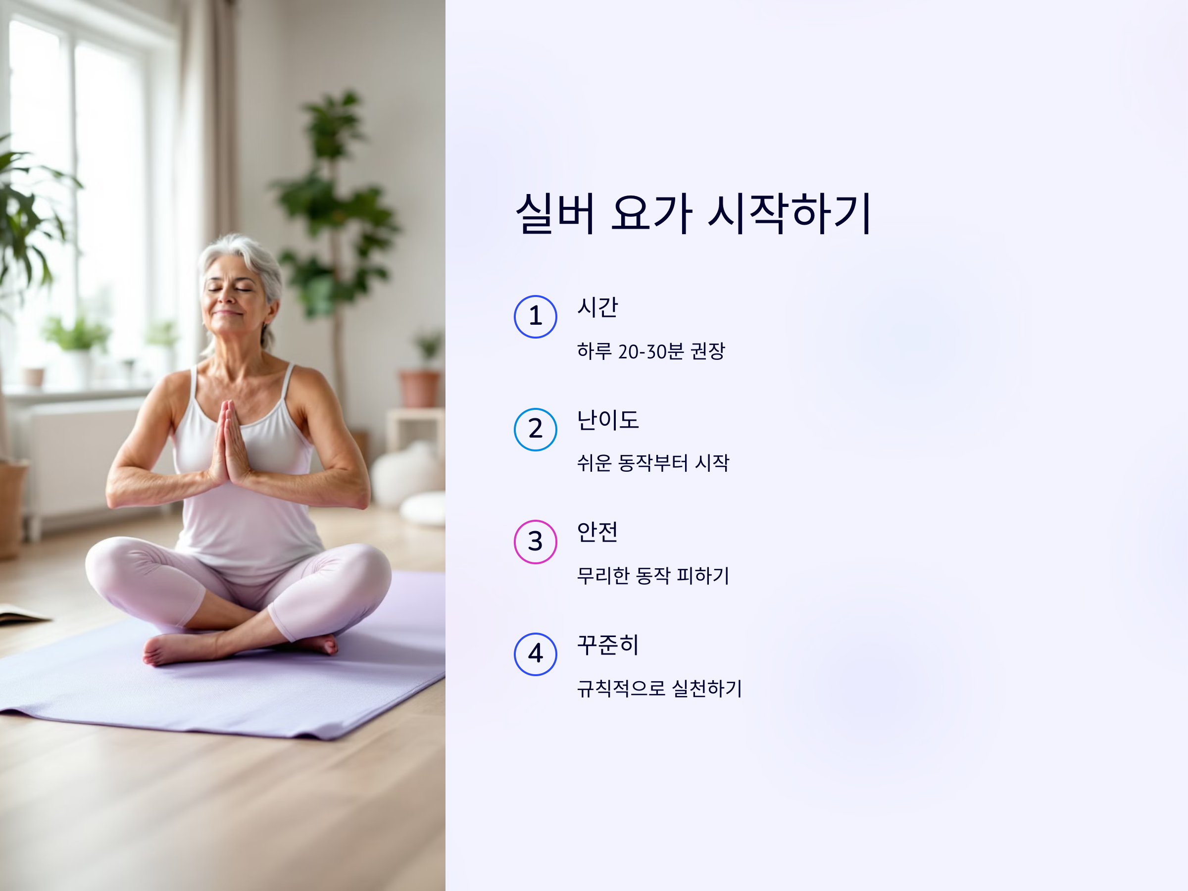 실버 요가는 나이가 들수록 신체 건강을 지키는 중요한 도구입니다. 초보자도 쉽게 따라 할 수 있는 동작부터 시작하여 점차 난이도를 높여가며, 균형과 유연성을 기르세요. 요가는 몸뿐만 아니라 마음의 안정과 힐링에도 많은 도움을 줄 것입니다.