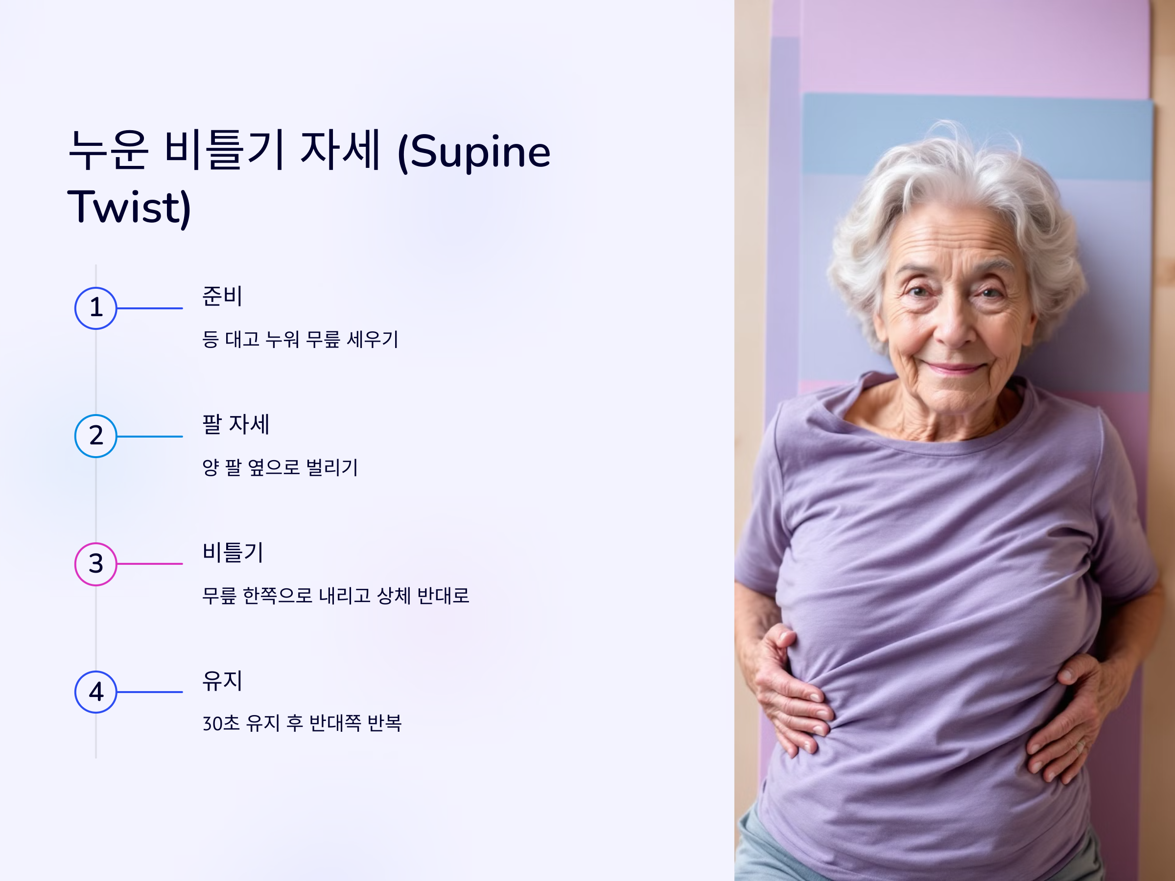 - 무릎을 한쪽 방향으로 천천히 내리고, 상체는 반대 방향으로 비틀어줍니다.