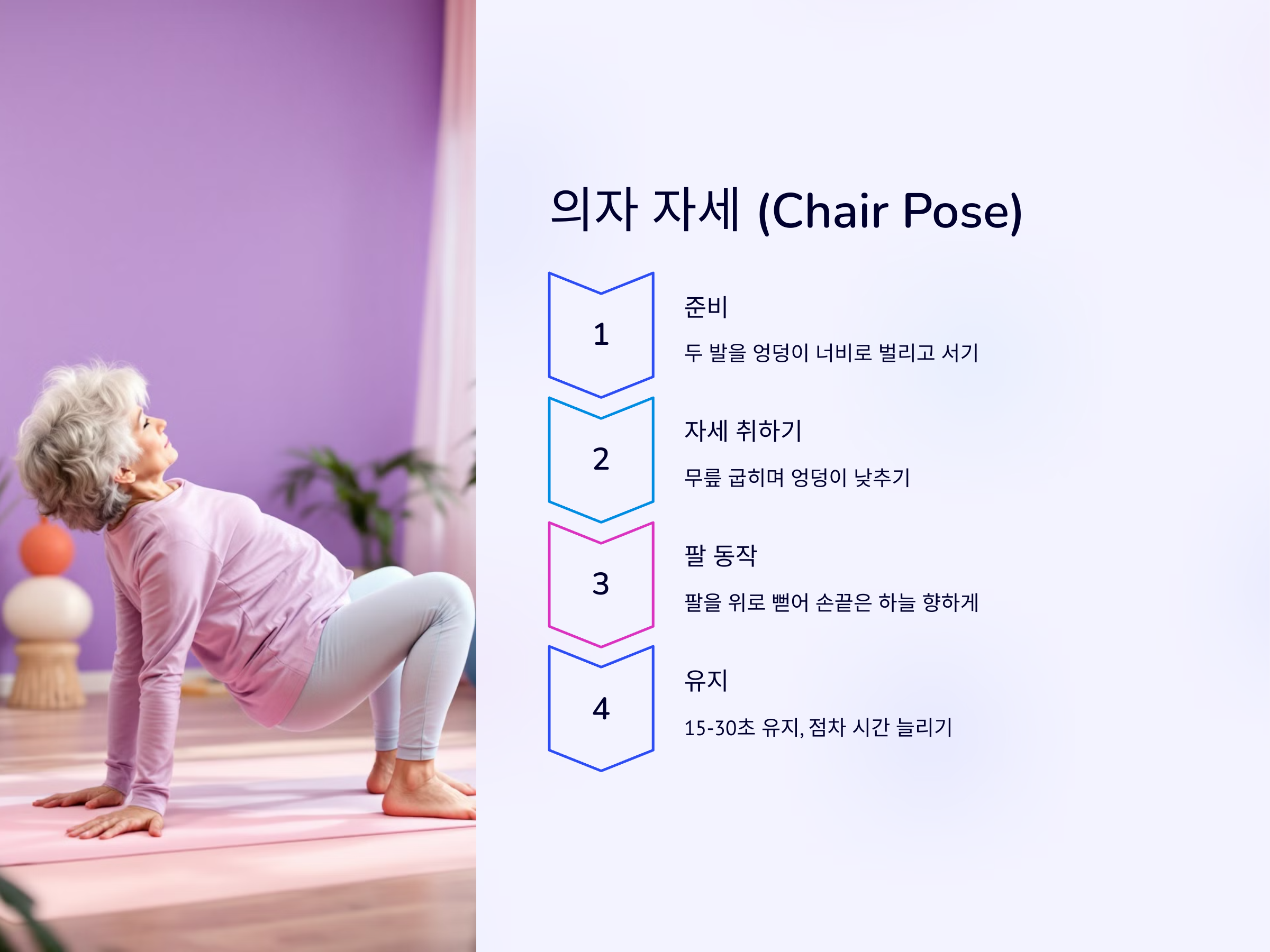 의자 자세는 하체를 강화하고, 엉덩이와 허벅지 근육을 단련하는 데 효과적인 동작입니다. 또한, 하체를 강화하면 무릎이나 허리에 부담을 줄일 수 있어 실버 요가에서 매우 유용한 동작입니다.