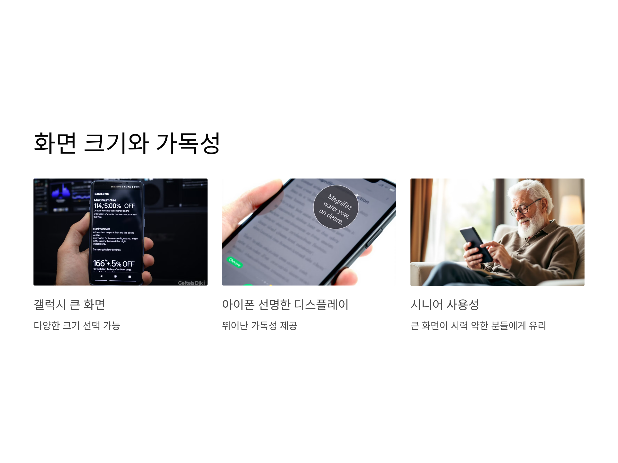 갤럭시는 다양한 화면 크기의 모델을 제공하므로, 시니어들이 필요로 하는 큰 화면을 선택할 수 있다는 장점이 있습니다. 큰 화면은 텍스트를 읽거나 사진을 보는 데 매우 유리하며, 눈이 나쁜 분들에게는 매우 중요한 요소입니다. 반면, 아이폰은 화면 크기가 제한적이지만, 기본적으로 디스플레이가 선명하고 가독성이 뛰어나 시니어들이 부담 없이 사용할 수 있습니다.