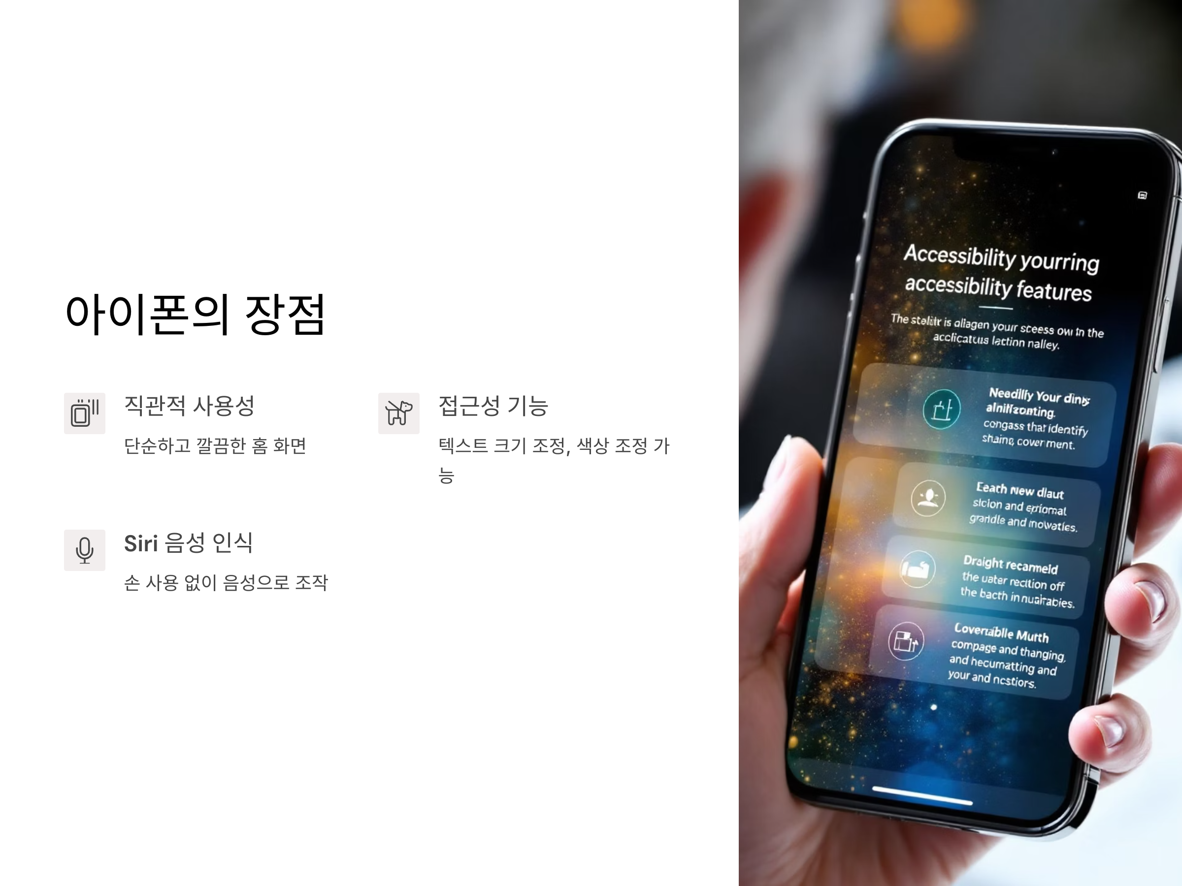 아이폰의 가장 큰 장점 중 하나는 '접근성' 기능입니다. 이 기능은 시니어들이 쉽게 스마트폰을 사용할 수 있도록 돕기 위해 다양한 옵션을 제공합니다. 예를 들어, 화면의 텍스트 크기를 키우거나 색상을 조정할 수 있는 기능이 있어 시력이 좋지 않은 시니어들에게 큰 도움이 됩니다. 또한, 음성 인식 기능인 Siri는 손을 사용하지 않고 음성만으로 스마트폰을 조작할 수 있어 편리합니다.
