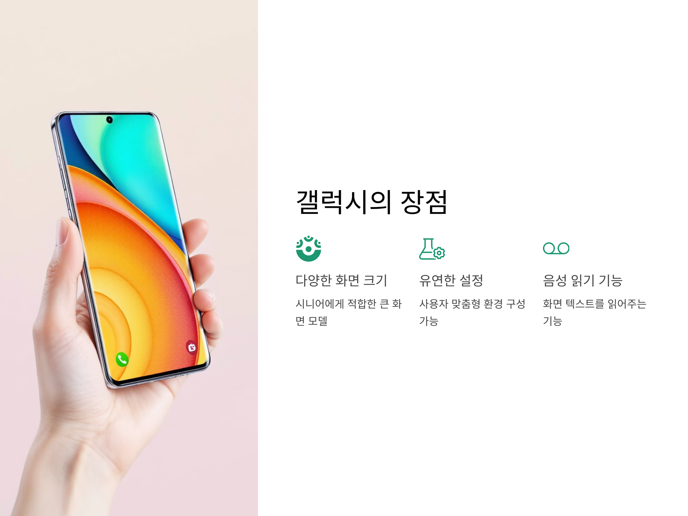 갤럭시 스마트폰은 안드로이드 운영 체제를 탑재하고 있어 사용자가 보다 유연한 설정을 할 수 있는 장점이 있습니다. 또한, 갤럭시는 화면 크기가 다양하고, 큰 화면의 모델들이 많아 시니어들이 더 편하게 볼 수 있는 환경을 제공합니다. 시니어들이 스마트폰을 사용할 때는 큰 화면이 매우 중요할 수 있기 때문에, 갤럭시는 시니어에게 더욱 적합할 수 있습니다.