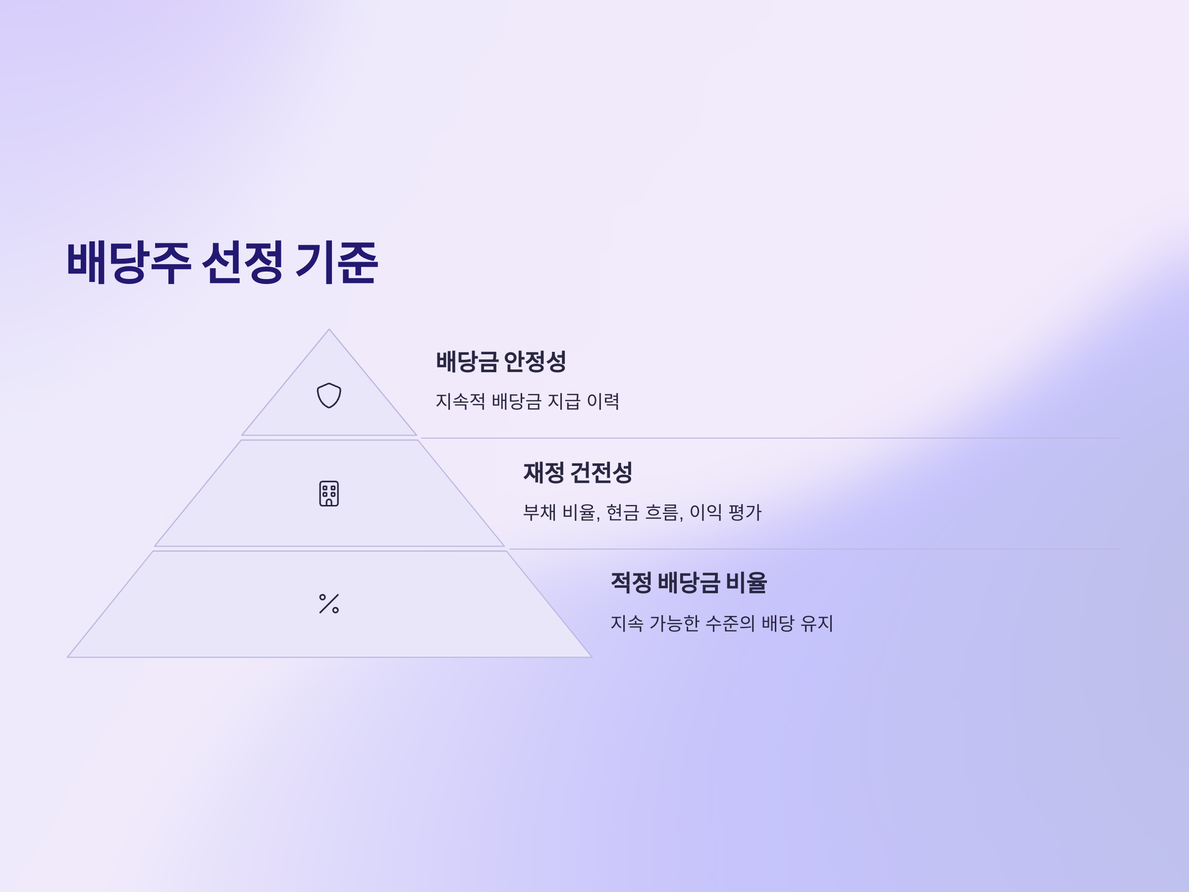 배당주를 선정할 때 가장 중요한 기준은 바로 배당금 안정성입니다. 배당금이 지속적으로 지급되고 있으면, 투자자는 안정적인 수익을 기대할 수 있습니다. 이를 위해서는 기업이 과거 몇 년간 안정적으로 배당금을 지급했는지 확인해야 합니다. 또한, 기업의 배당금 지급 비율도 중요합니다. 너무 높은 배당금 비율을 지급하는 기업은 미래에 배당금을 지속적으로 지급할 수 있을지 불안할 수 있기 때문에, 안정적인 배당금 지급이 가능한 수준의 배당금 비율을 찾는 것이 중요합니다.