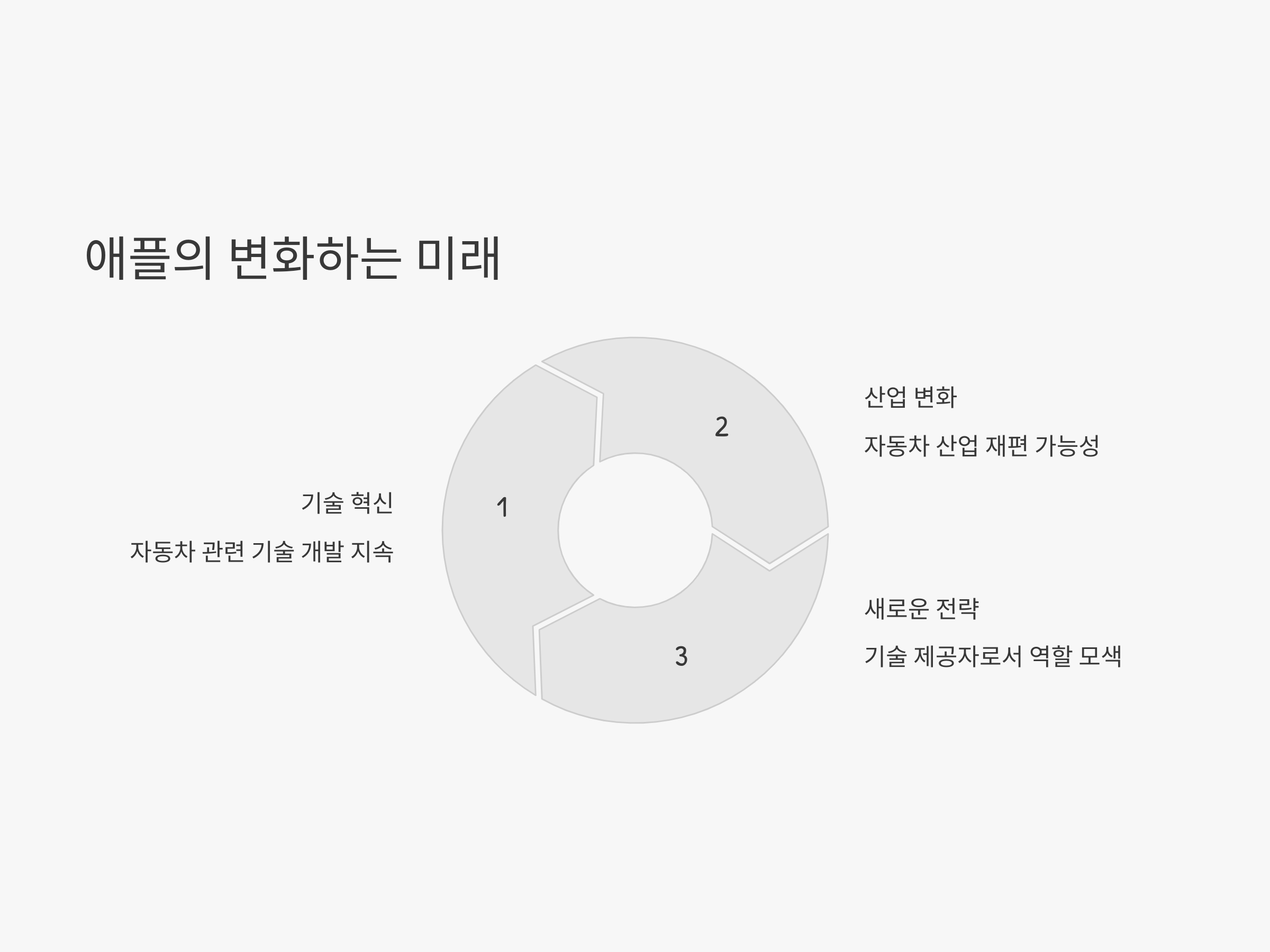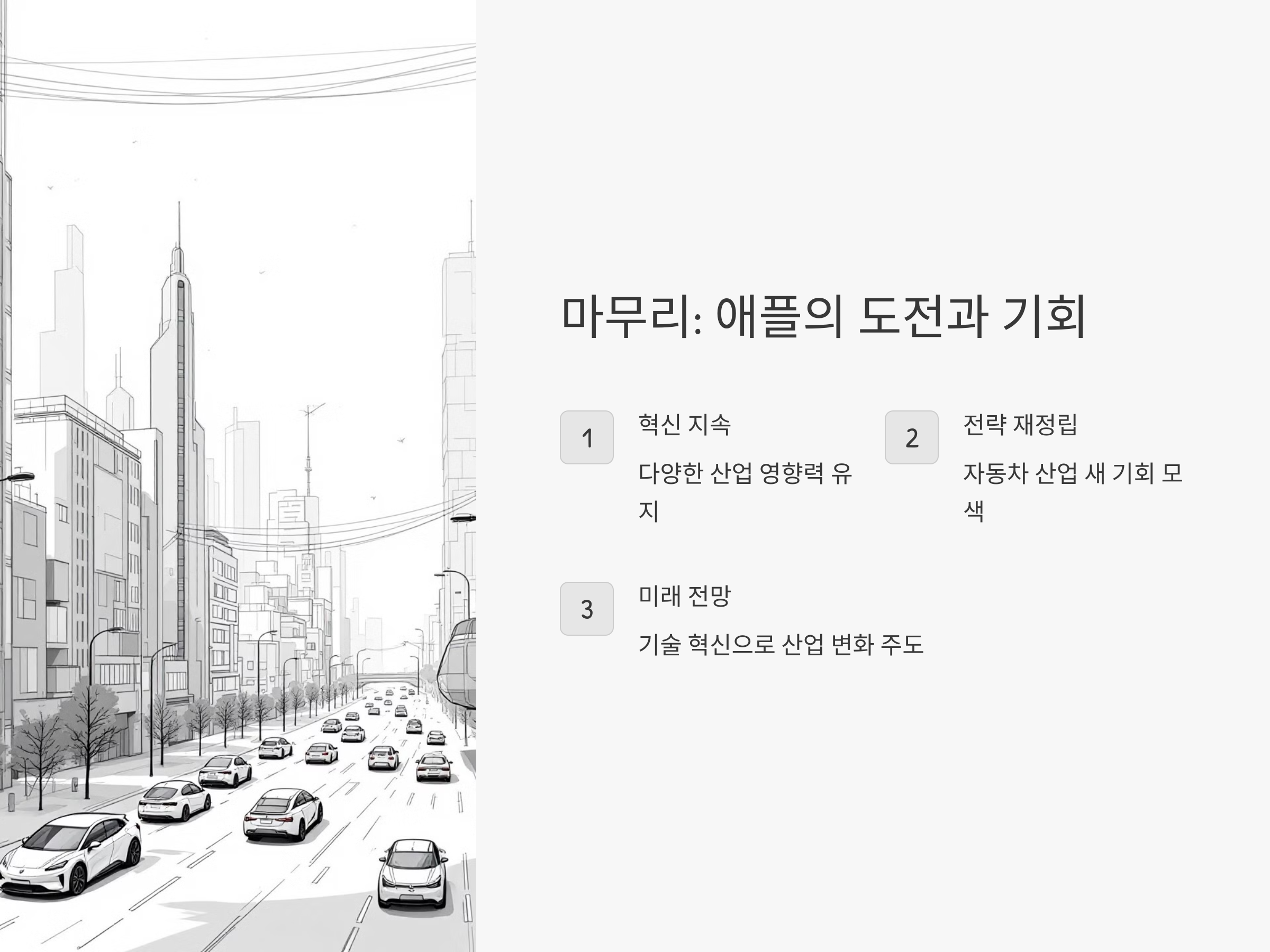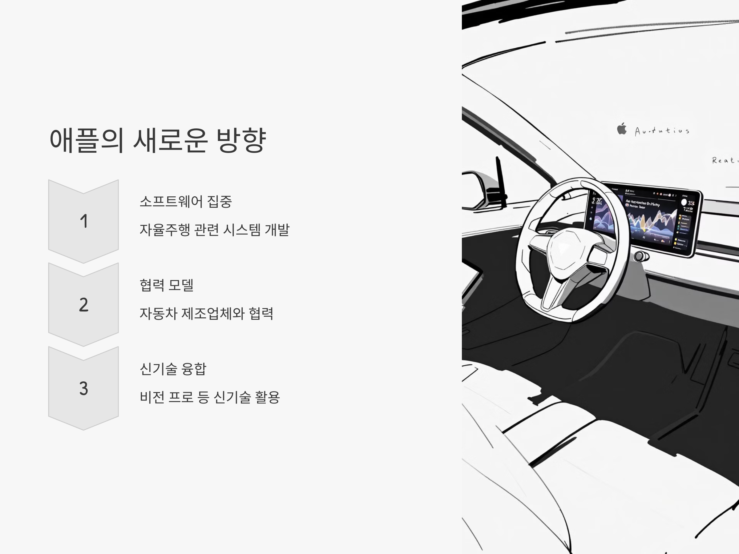 애플은 그동안 '애플카'라는 이름을 내세우며 시장의 주목을 받았으나, 이제는 다른 방식으로 시장을 재편성할 수 있는 기술적, 전략적 방향성을 모색해야 할 시점에 있습니다. 애플의 변화를 지켜보는 것도 앞으로의 중요한 관전 포인트가 될 것입니다【7†source】【9†source】.