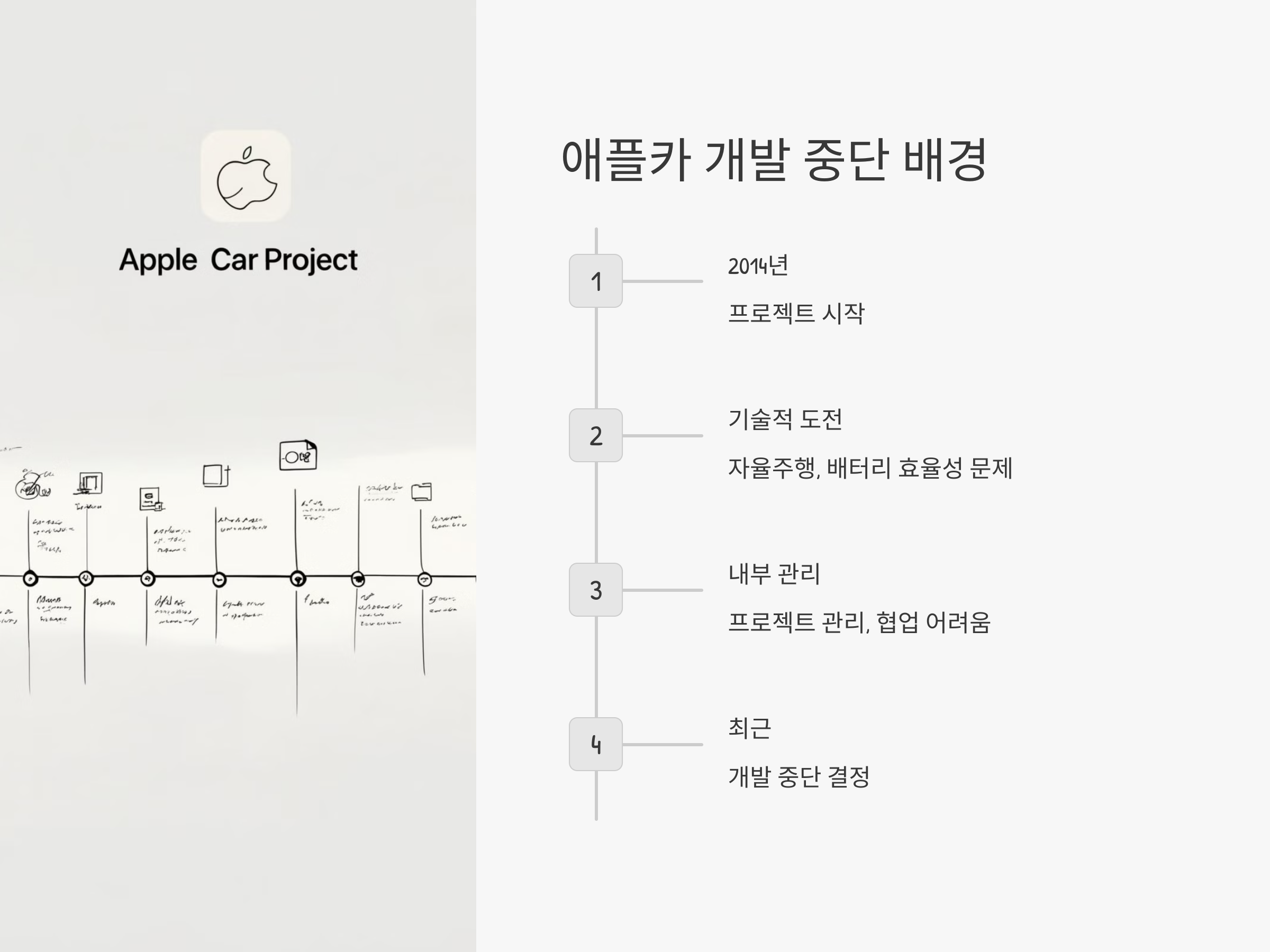 애플은 약 10년 동안 자율주행차, 또는 '애플카'라는 이름으로 자동차 시장에 도전장을 내밀었습니다. 2014년부터 시작된 이 프로젝트는 많은 시간과 자원, 그리고 연구개발이 투입되었지만, 최근 들어 그 중단 가능성에 대한 소식이 점점 더 커지고 있습니다. 다양한 내부 인사들의 발언과 외부 전문가들의 예측에 따르면, 애플은 더 이상 자율주행차 시장에 진입하기 위한 독자적인 차량 개발을 지속할 의지가 없다는 분석이 지배적입니다【6†source】【7†source】.