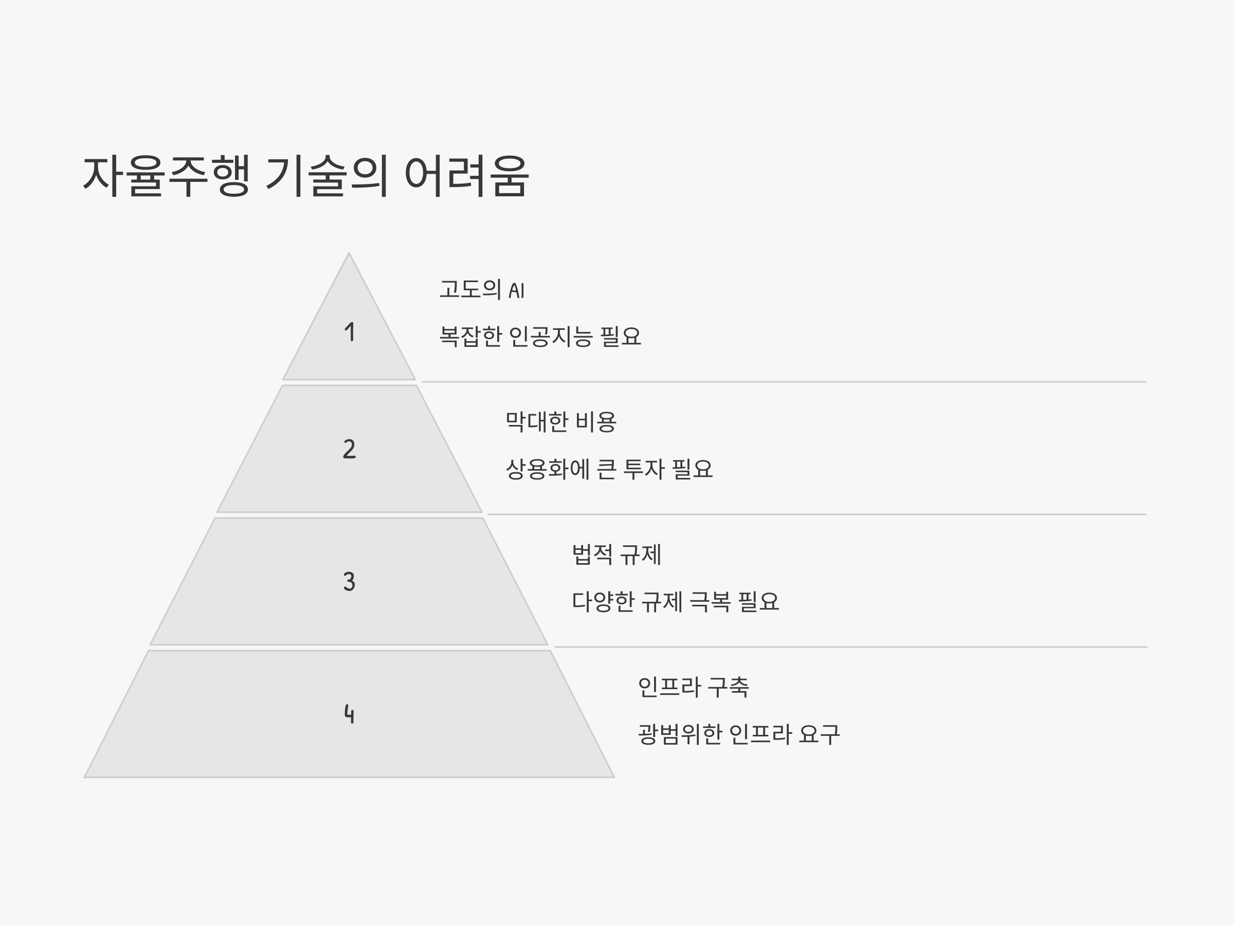 애플이 자율주행차 개발을 중단한 이유 중 하나는 바로 자율주행 기술의 복잡성과 그것을 상용화하는 데 필요한 막대한 비용 때문입니다. 자율주행차는 단순한 차량 제조를 넘어서, 고도로 발전된 인공지능(AI)과 머신러닝을 필요로 하며, 이를 구현하기 위한 기술력은 다른 자동차 제조업체들보다 훨씬 더 발전해야 합니다.