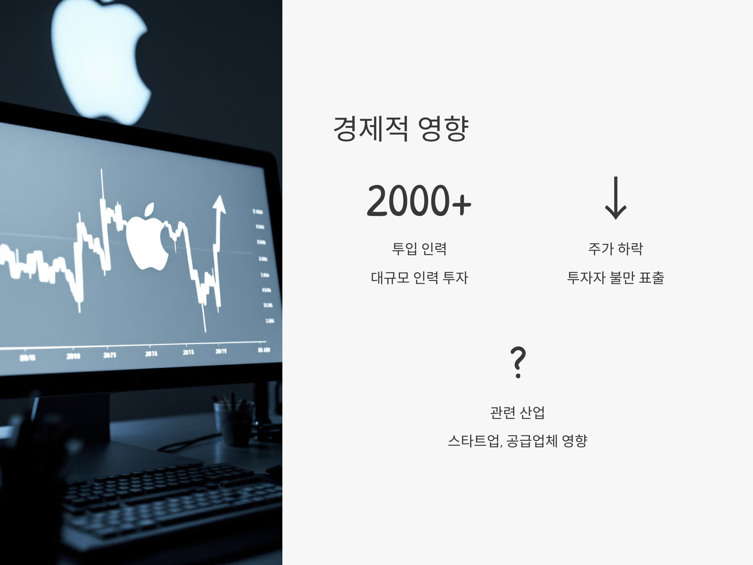 애플카의 중단은 애플의 주식 가치에 직격탄을 날린 것으로 보입니다. 애플은 이 프로젝트를 위해 약 2,000명 이상의 인력을 투입했으며, 그만큼 많은 자금을 투자했기 때문입니다. 이에 대해 일부 애플의 투자자들은 불만을 표출하며, 주가 하락의 원인으로 애플카 프로젝트의 중단을 지목하고 있습니다.