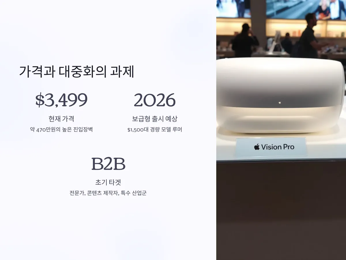 향후 애플은 보급형 모델 출시를 통해 일반 소비자 시장으로의 확장을 시도할 것으로 보이며, 부품 단가 하락과 비전OS 최적화를 통해 더 저렴한 가격대의 모델이 출시될 가능성이 있습니다. 현재 루머에 따르면 2026년 내 $1,500대의 경량 모델이 나올 것으로 보입니다.