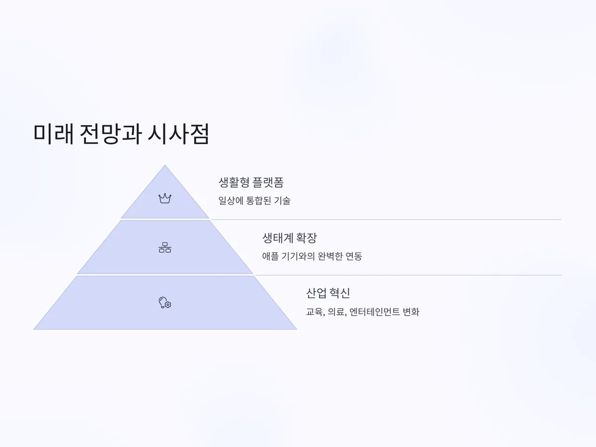 삼성전자가 자체 MR 기기를 개발 중인 상황에서, 애플은 국내 시장에서의 기술 우위를 점하기 위해 이통사 및 콘텐츠 기업과의 제휴를 추진할 가능성이 높습니다. 또한 교육, 헬스케어, 스마트홈 등 다양한 융합 산업군에 진입하기 위한 사전 포석도 동시에 진행되고 있습니