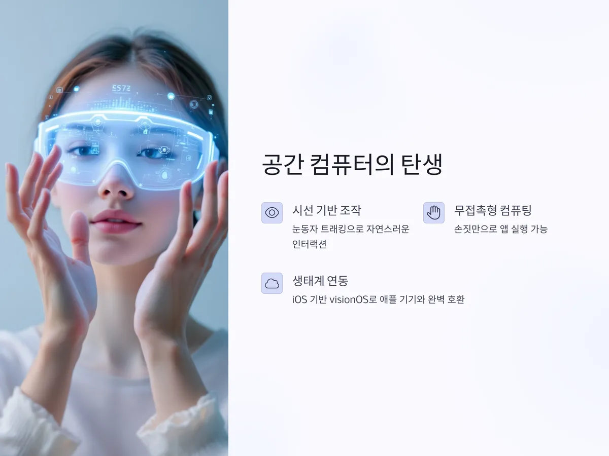 비전 프로는 더 이상 'VR 헤드셋'이라는 제한된 정의에 갇히지 않습니다. 애플은 이를 '공간 컴퓨터(spatial computer)'로 명명하며, 실제 환경 위에 디지털 요소를 결합하는 혼합현실의 미래를 제시했습니다. 사용자 눈동자를 트래킹하여 시선 기반 조작이 가능하고, 손짓만으로 앱을 실행하며, 음성명령까지 자연스럽게 작동합니다. 즉, 화면을 터치하지 않아도 모든 인터랙션이 가능한 ‘무접촉형 컴퓨팅’의 시작이라 할 수 있습니다.