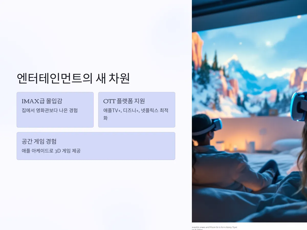 영화관에서만 느낄 수 있던 IMAX급 몰입감을 이제 집에서도 경험할 수 있게 되었습니다. 애플TV+, 디즈니+, 넷플릭스 등 주요 OTT 플랫폼이 지원되는 비전 프로는 공간 사운드와 함께 실제 상영관보다 더 몰입적인 환경을 제공합니다. 실제로, 화면 크기를 조절하고, 앉은 위치에 따라 시야가 변경되는 기능까지 갖추고 있어 사용자 맞춤형 경험이 가능합니다.