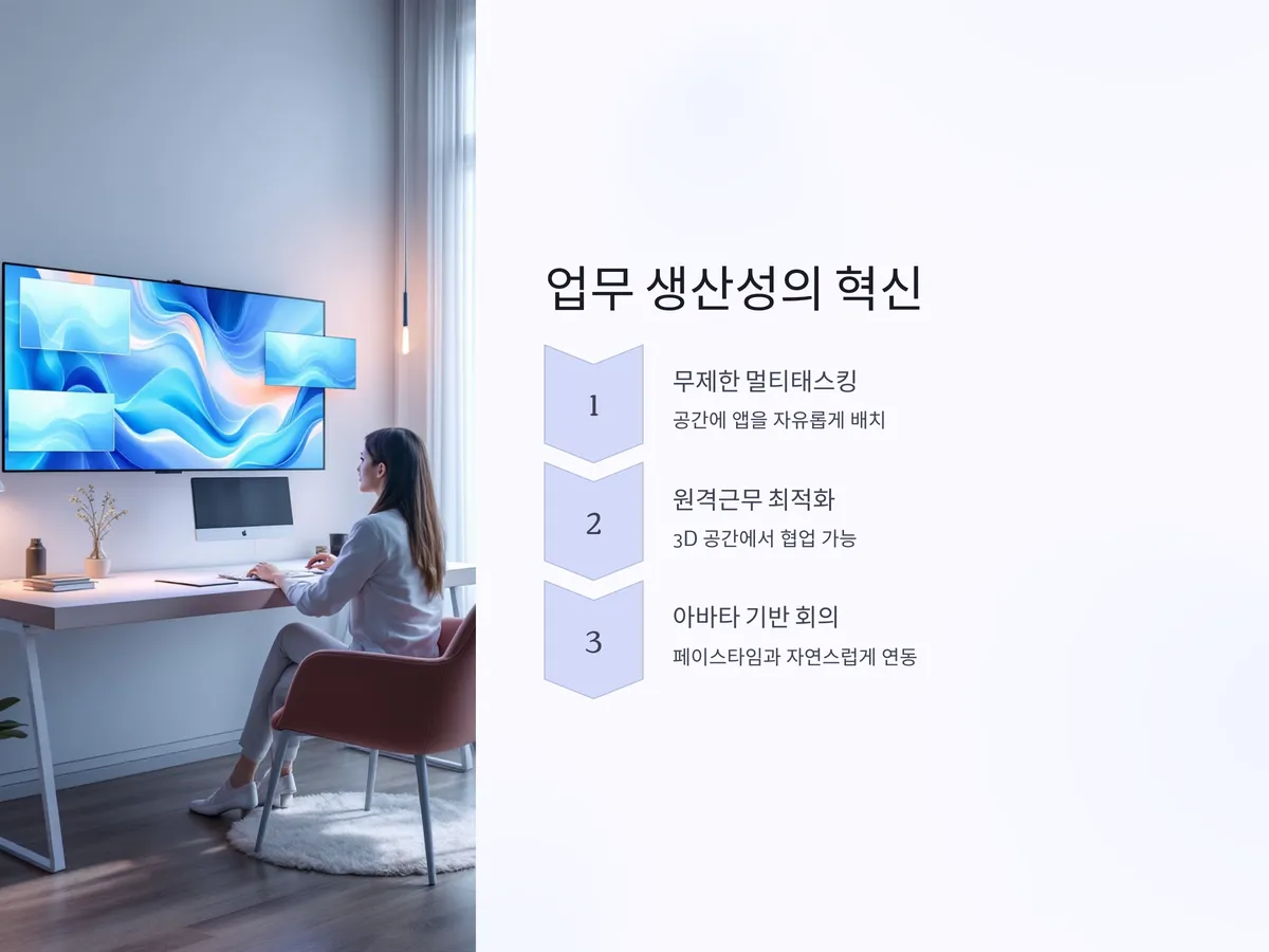 이러한 구조는 기존 원격근무자, 디지털 노마드들에게 특히 유용하며, 화상회의 중 참여자의 얼굴이 공간에 나타나거나, 파워포인트 프레젠테이션을 3D 공간에 띄워 공유하는 것도 가능합니다. 애플 페이스타임과의 연동으로 아바타 기반 회의가 자연스럽게 연결되며, 이는 메타버스보다 현실적인 협업 솔루션이라는 평가를 받고 있습니다.