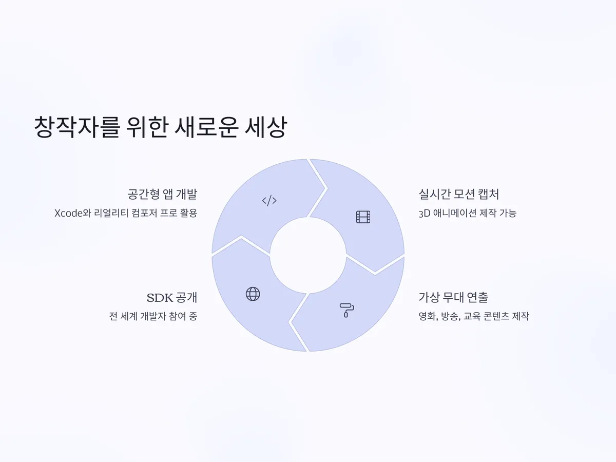 비전 프로는 단순 소비자용 기기를 넘어서 창작자와 개발자에게 새로운 가능성을 열어주고 있습니다. Xcode와 리얼리티 컴포저 프로(Reality Composer Pro)를 활용해, 공간형 앱을 제작할 수 있으며, 기존의 앱도 visionOS에 맞게 손쉽게 이식이 가능합니다. 현재 애플은 전 세계 개발자에게 SDK를 공개하고 있으며, 이미 수천 개의 앱이 공간 컴퓨팅에 맞춰 리디자인되고 있습니다.